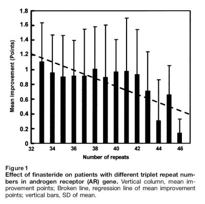 Wenn man sich trotzdem mal das Ergebnis ansieht, dann finde ich es auch nicht so überzeugend. Mit zunehmender Anzahl von Wiederholungen soll der Effekt von Finasterid nachlassen. Vergleicht man aber z.B. 34,35,36 Repeats mit 40,41,42 Repeats, so war Finasterid bei letzteren erfolgreicher. Nur bei 44 und 46 gibt es einen Einbruch, wobei 45 wieder deutlich erfolgreicher war. Natürlich kann es sein, dass Finasteriderfolg und Triplet repeat Anzahl irgendwie zusammen hängen . Aber dieser Artikel beweist meiner Ansicht nach nichts. Zeigt diese Studie vielleicht nur, dass eine Alopezie mit zunehmender Repeatanzahl aggressiver verläuft, ob mit oder ohne Fin? Wo ist die Placebogruppe?