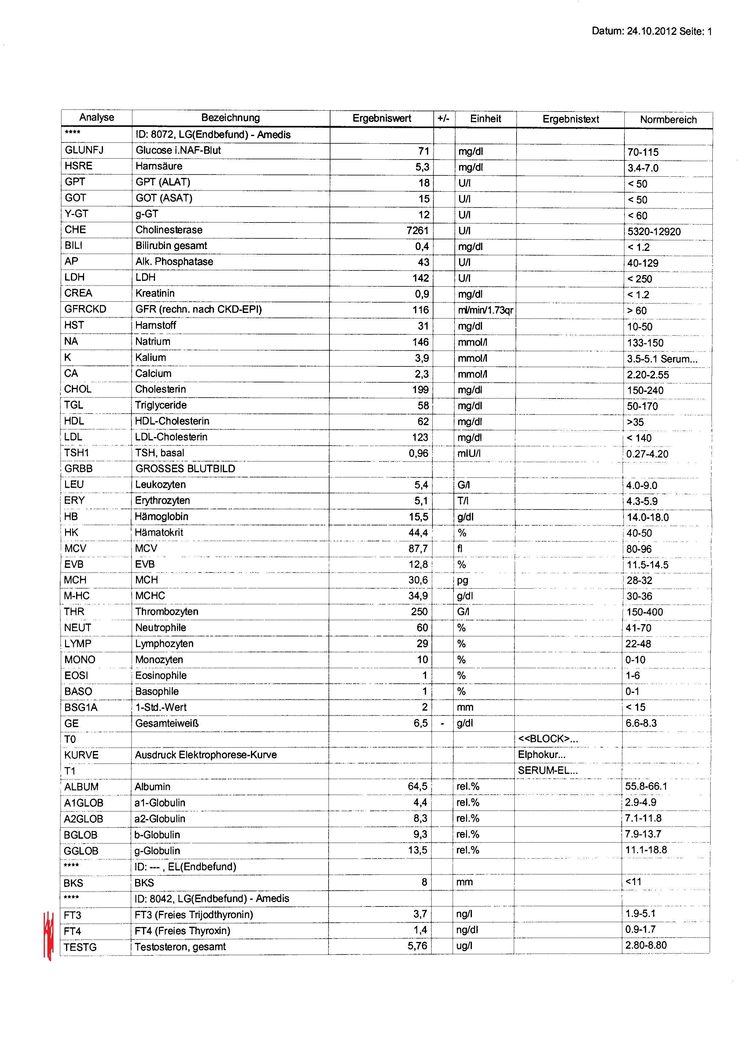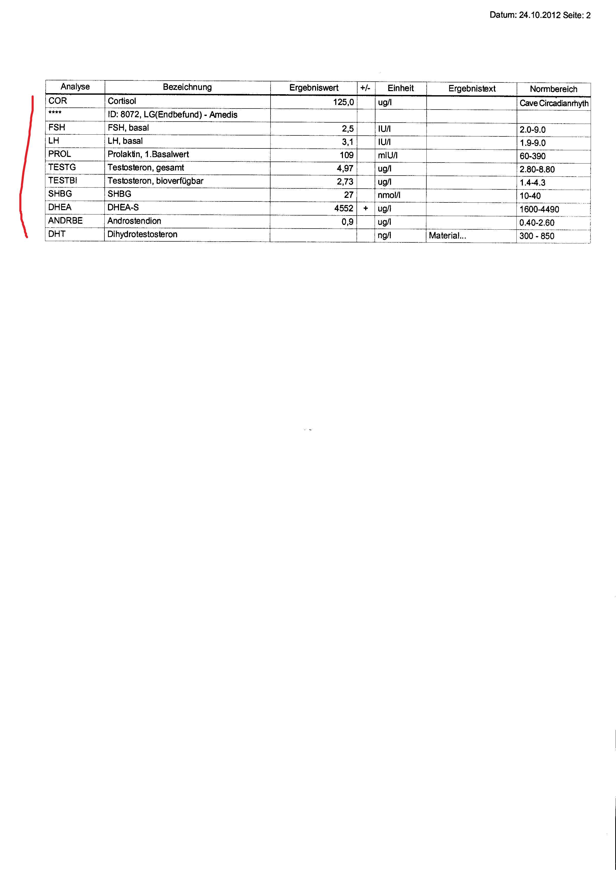 Habe jetzt nach langem Warten endlich meine Werte von Endokrinologen bekommen. Hormonwerte sind rot markiert. Blutabnahme erfolgte 1 Monat nach Absetzten von Fin, ich denke da sollte sich das meiste schon eingependelt haben. Kann jemand was zu den Werten sagen?
