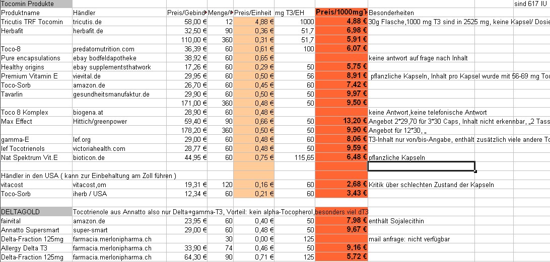 Hier eine Liste von verschiedenen Produkten mit Preis pro Gramm T3 aus Tocomin und Deltagold (ohne Versand)