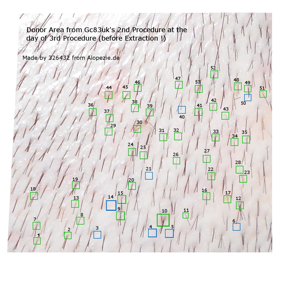 Auf diesem Bild unten im Anhang ist der Empfängerbereich vom GC83uk bei der 3. Prozedur zu sehen. Wenn man auf die blutigen Grafts sieht , dann sieht man vornehmlich 1er und 2er Grafts vielleicht eher seltener auch einen 3er- Graft. Das macht im Durchschnitt 1,75 Haare pro Graft. (Der durchschnittliche Mensch hat 2). Es handelt sich also um ein eher schlechteres Verhältnis.