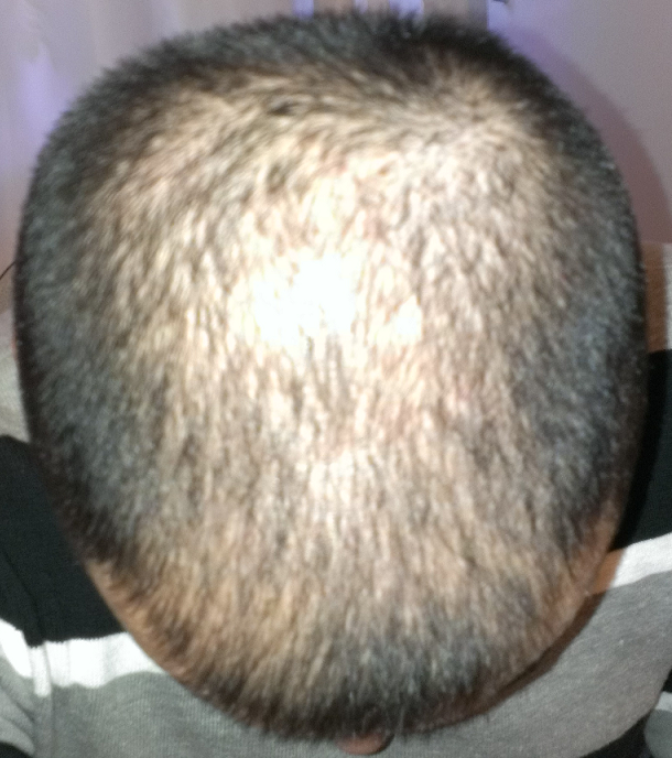 fast nur noch kleine helle Härchen übrig und man sieht bei starkem Licht die Kopfhaut.