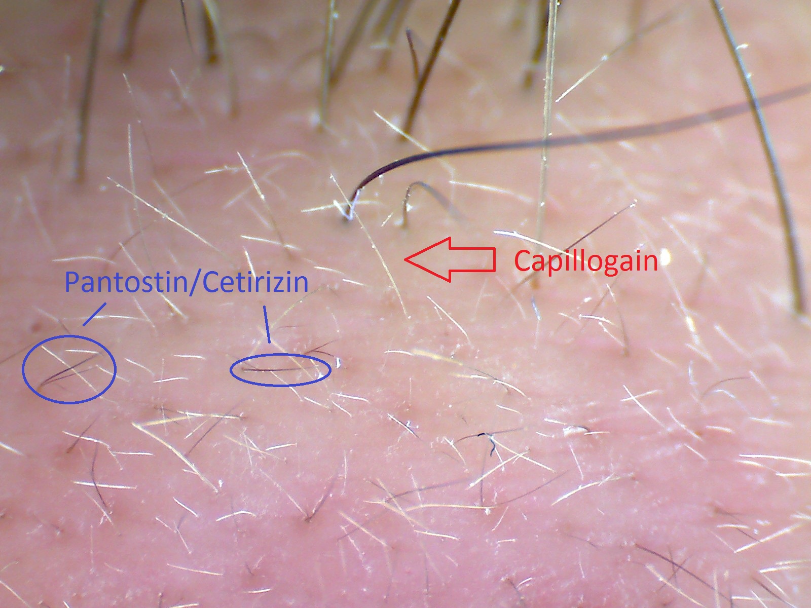 Sind nur ein paar neue Vellushärchen aber interessant finde ich, dass Capillogain wohl doch einen anderen Wirkmechanismus besitzt als mein restliches Regimen. Ich schmiere ja auch an dieser Stelle (Witwenspitz/Mittlere Front) nun schon seit geraumer Zeit Minox, Panto/Cet und Progesteron aber bislang sind dort nur diese wenigen, pigmentierten, kurzen Härchen gewesen. Mit Capillogain nun relativ schnell neue Vellushärchen.
