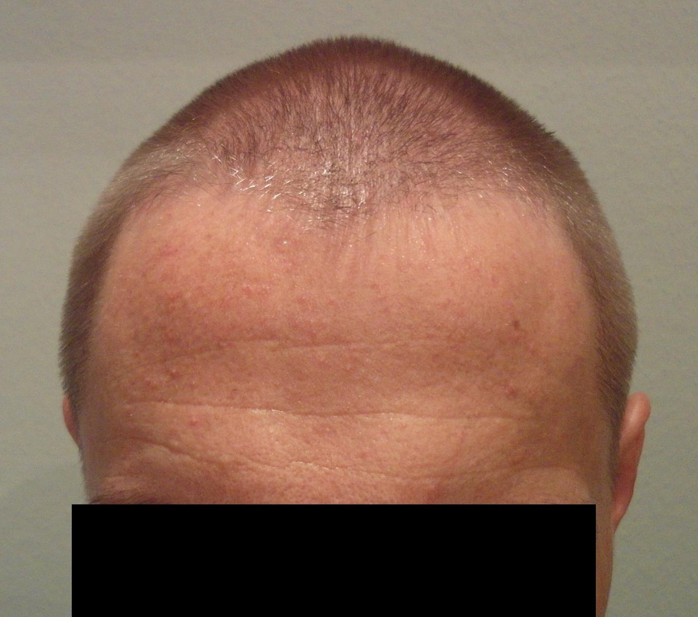 Vorne an der Front ist es schon ziehmlich ausgedünnt. Da kann man genau erkennen, dass da nur noch ganz feine Haare sind. Bei mir scheint Fin nur im Tonsurbreich so richtig gewirkt zu haben.