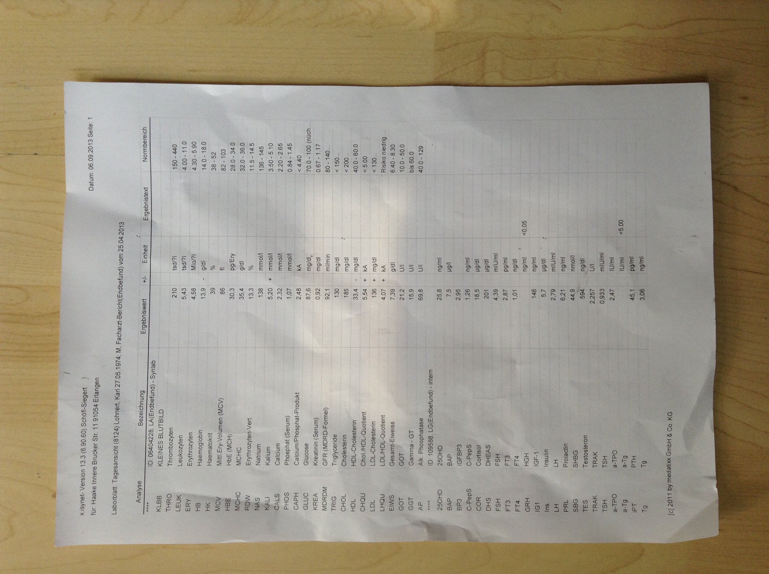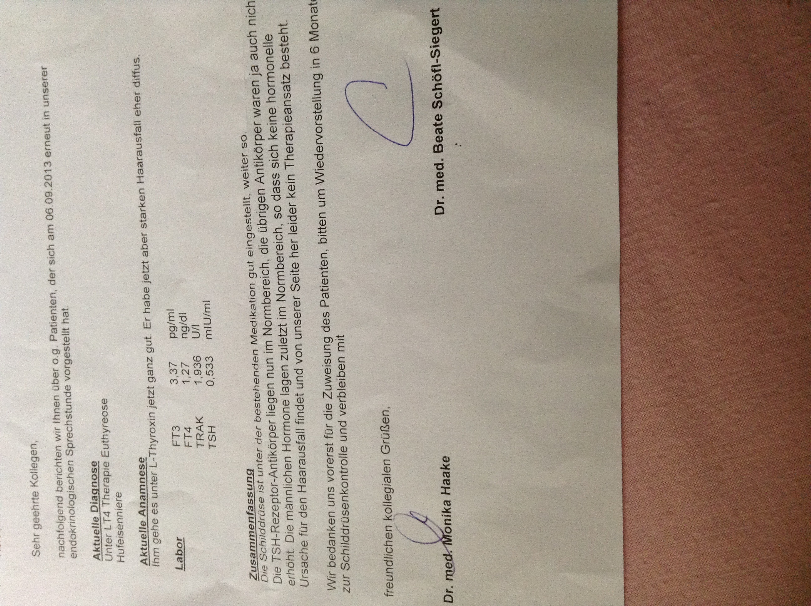 Du brauchst die Normwerte von fT3 und fT4. Ohne diese sind die aktuellen Werte nicht aussagekräftig. Auf die Aussage der Ärztin, dass diese passend wären, würde ich mich nicht verlassen. Daher: Normwerte holen (Ober- und Untergrenze) Exclamation