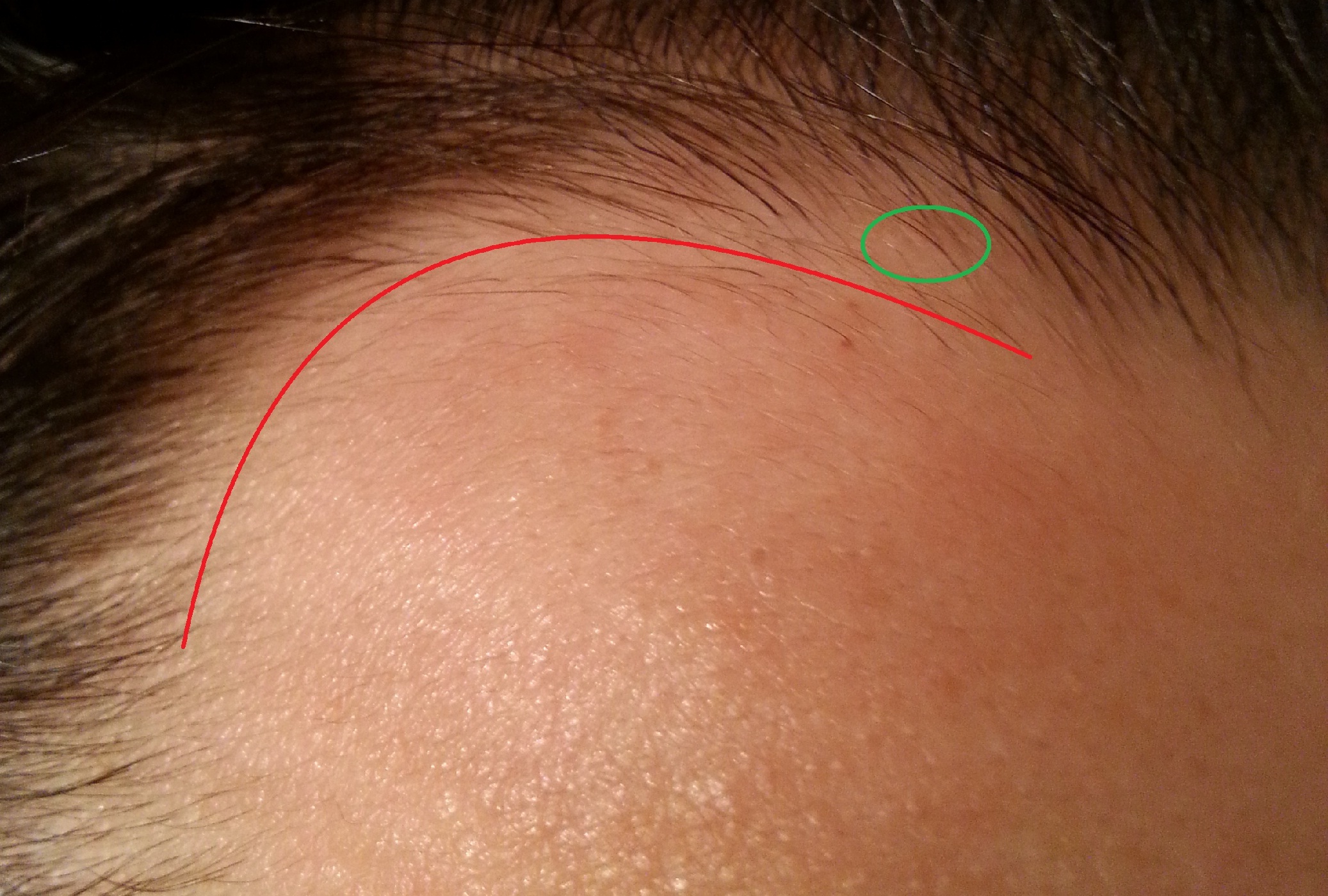 Dann nun noch ein Bild von der rechten Geheimratsecke im Anhang. Ich bin mir 100% sicher, dass die Harre unterhalb der roten Linie vorher nicht zu sehen waren. Im grünen Kreis war vorher schon eine kleine Lücke in der Haarlinie, unterhalb dieser Lücke, war immer alles blank (kommt auf dem Foto leider nicht so eindeutig rüber).