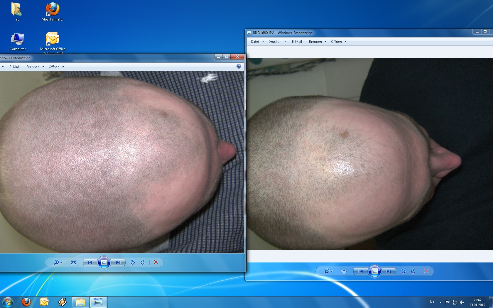 Ja, ist ein etwas anderer Winkel, ist halt schwierig das immer gleich zu fotografieren. Auf dem neuen Bild sind die Haare zudem kürzer (gestern erst ohne Aufsatz rasiert). In beiden Fällen ist übrigens eingetrocknetes Regaine auf der Kopfhaut (das vorher-Bild habe ich so am 3. Tag nach Therapiebeginn aufgenommen).