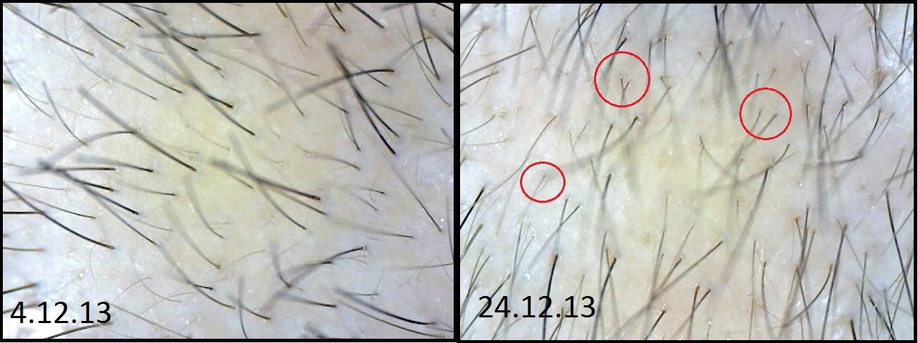 Da kaum jemand den imgur link besucht dachte ich, ich mach hier ein Bild rein. Im Vergleich zu den Bildern vom 4.12. habe ich mehr solcher Haarpärchen bzw. sie sind deutlich sichtbarer geworden. Auf unbetroffenen Stellen am Hinterkopf z.B. sind es auch immer zwei bis drei nebeneinander.
