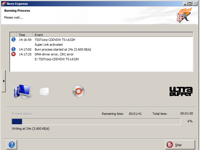 Sehe gerade die Fehlermeldung "CRC Error". Wechsel mal das Datenkabel vom Brenner zum Mainboard. Der wird wohl noch IDE haben.