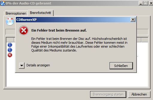 momentan ist echt der Wurm drin... Bekomme beim Brennen von CDs immer den o.g. Fehler (siehe auch Anhang), danach wird abgebrochen und ich kann die Disc in die Tonne werfen. Treiber habe ich schon deinstalliert und neu gestartet, hat nix gebracht.