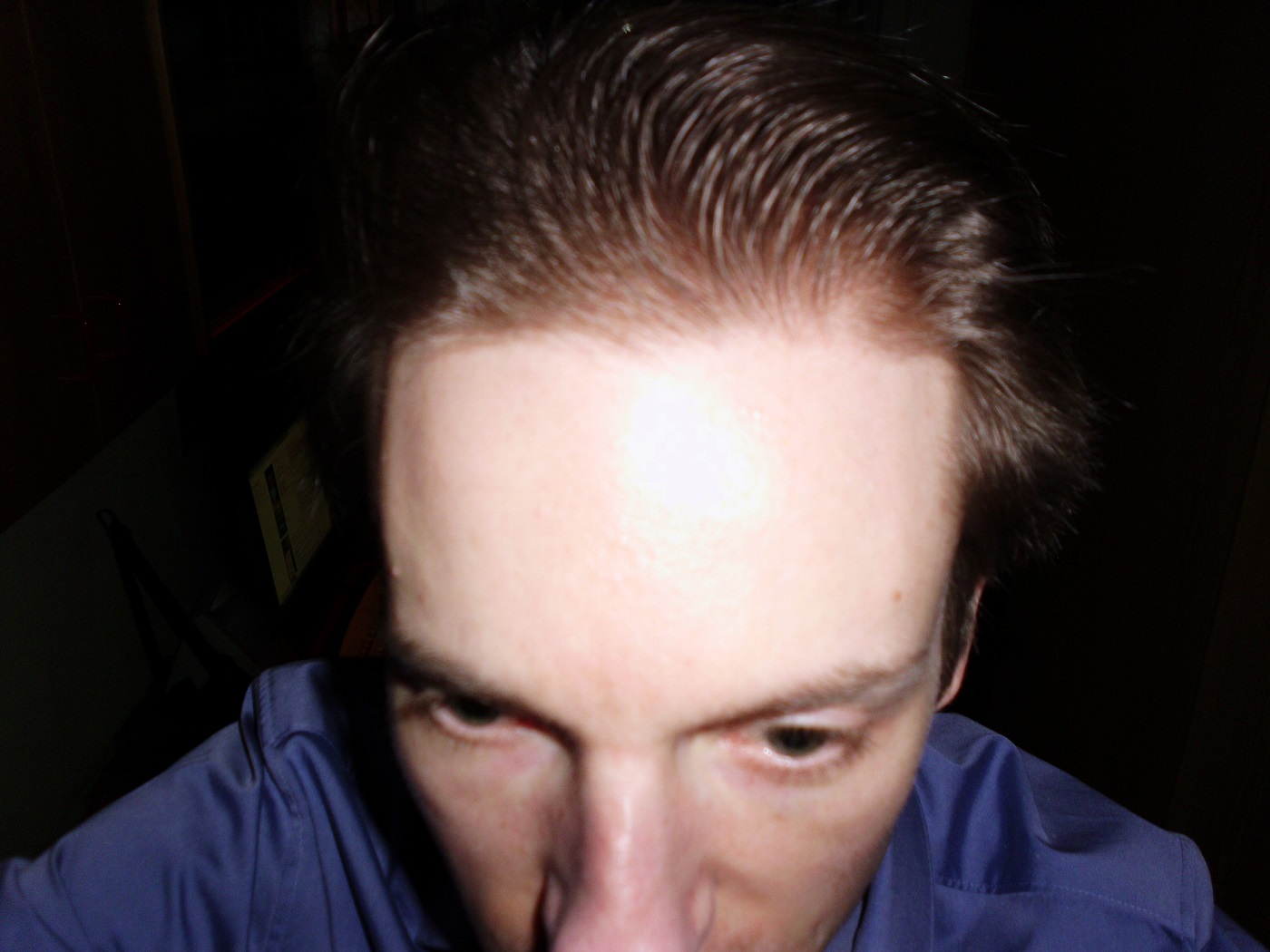 Ist das schon Haarausfall oder doch nur ein Wirbel an der Stirn? Ich meine den Bereich rechts wenn man auf das Foto schaut. Dort scheint ein ganzer Bereich fast kahl zu sein, der ganze Bereich dort sieht total schütter aus, oder sehe ich das falsch? Das zieht sich 5-10 cm nach hinten diese fast kahle Stelle, also bis zur Mitte des Schädels in etwa. Mal ist es stärker, mal ist es schwächer, aber sogar wenn ich die Haare wie der Ex-Minister Guttenberg nach dem Duschen (wenn die Haare noch feucht oder nass sind), nach hinten kämme, scheint dieser Bereich kahler und schütterer als der Rest der Haare. An der anderen Stirnseite, also links, scheint das Haar viel dichter zu sein.