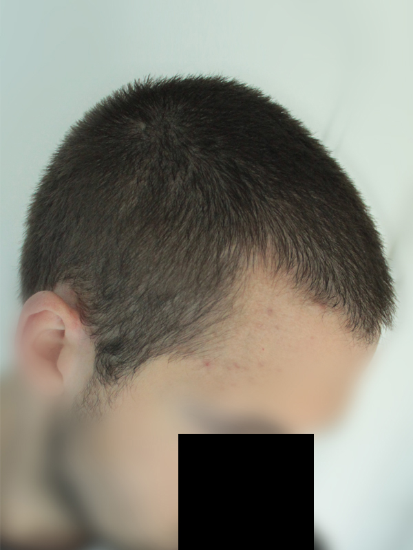 Man sieht es an der Front (schätze ca. 3cm Bereich hinein), dass mehr 1er Grafts sind und die Dicke weniger ist, außerdem sieht man die typischen Fransen am Haaransatz, die miniaturisieren. Die V-Form lässt sich erahnen.