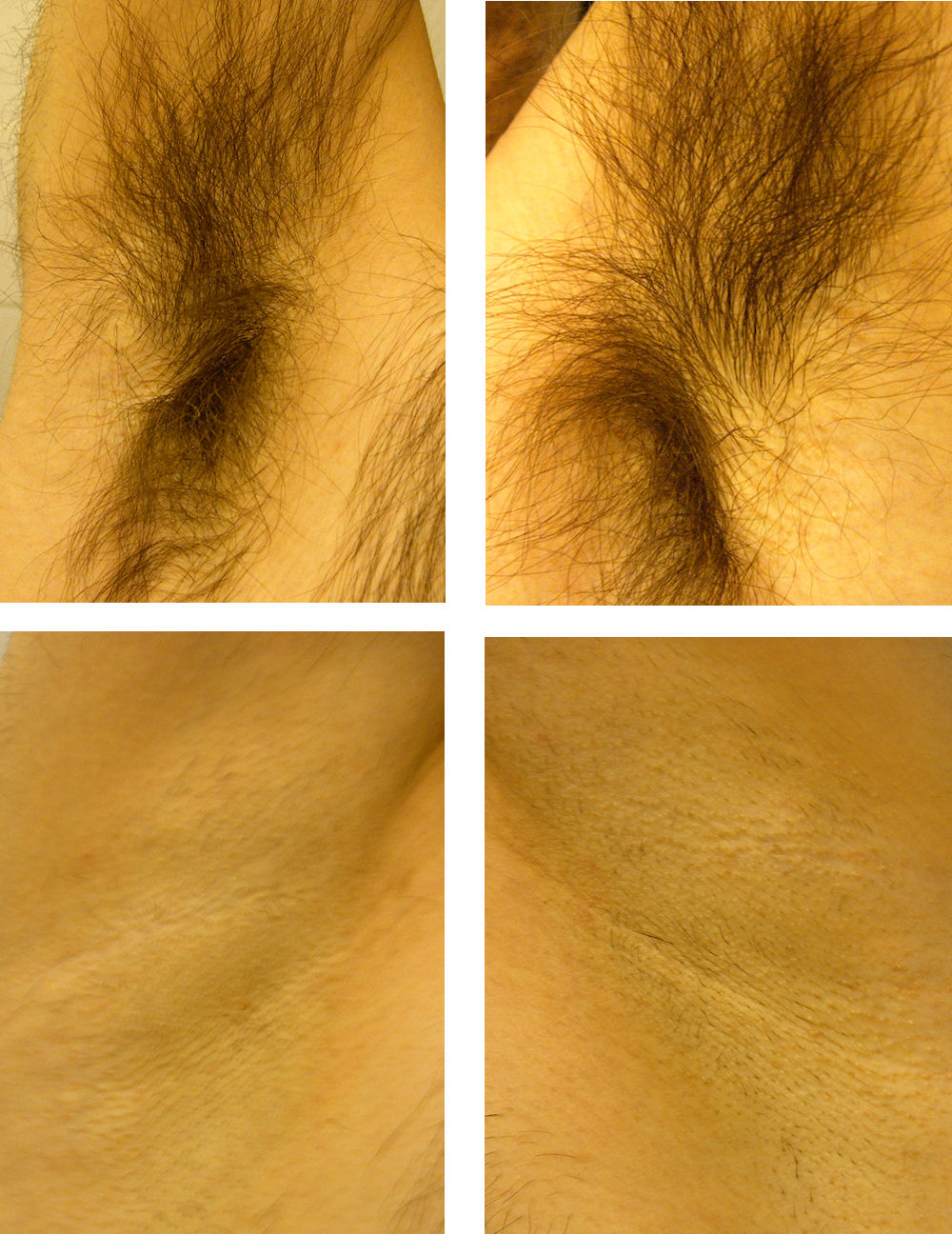Hier der Vorher- Nachher-Vergleich: Oben Achseln L und R vorher, großer Haarbusch! Trimmen oder Rasieren führt zu dem Gefühl