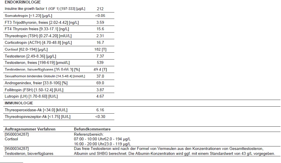 Ansonsten fällt auf, dass IGF1 im unteren Referenzbereich, Cortisol im oberen Referenzbereich liegen.