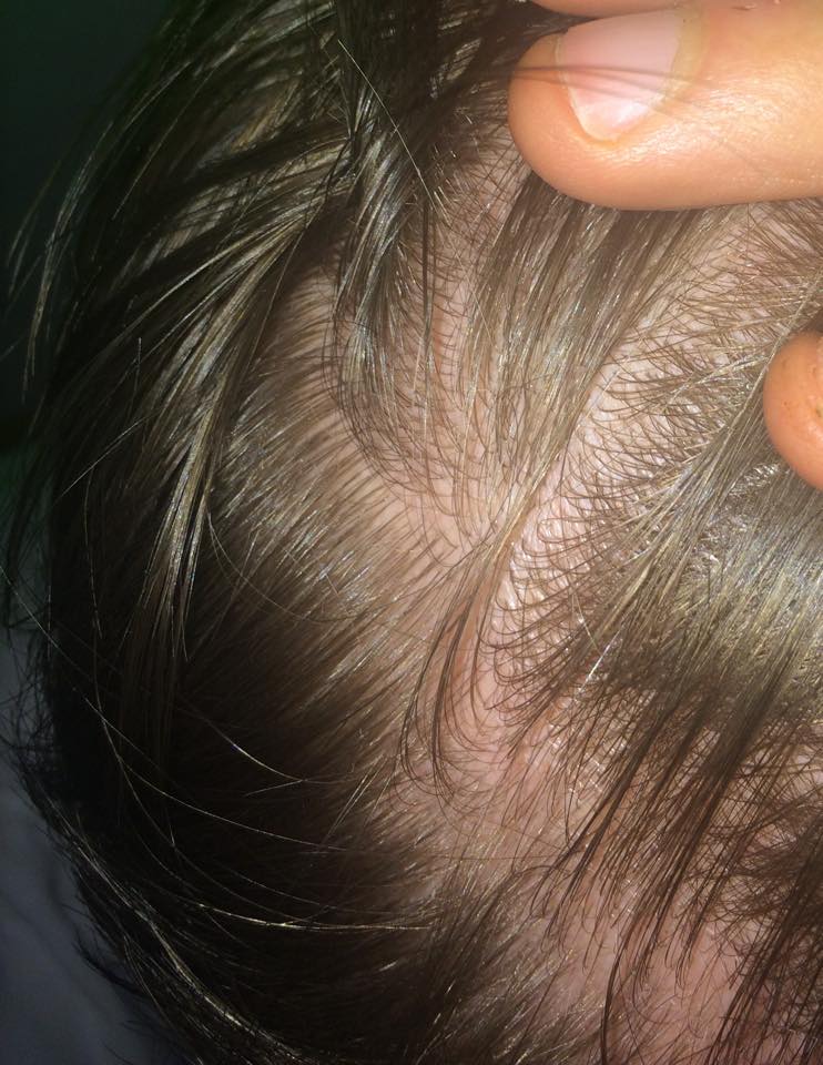 Angefangen hat eigentlich alles mit 14 Jahren.. Kreisrunder Haarausfall.. (siehe Bild) Das kleine Loch hat mich nie gestört, da der Rest ja immer voll und ganz okay war.. Klar natürlich, der Haarausfall ist an den bekannten Stellen (Geheimratsecken und Hinterkopf (Platte)) zu erkennen, allerdings auch sonst überall. Ich verliere am Tag nichtmal 70 Haare, ich kann daran rumreißen, es löst sich kein einziges.