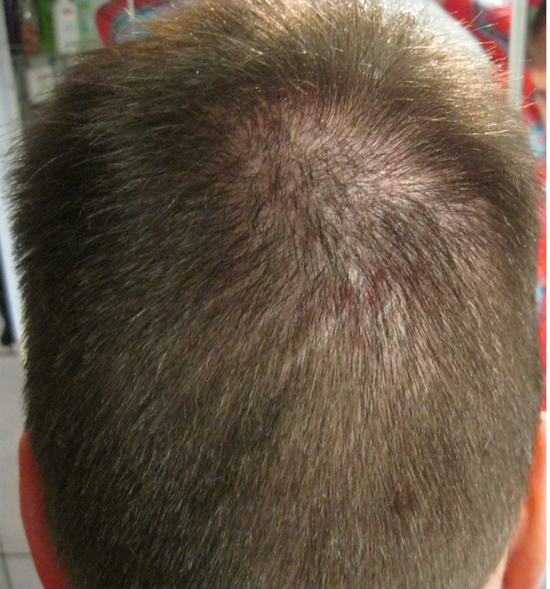 Es war anfangs nur der Oberkopf betroffen und nun auch hinten. Die Seiten sind nicht von Schuppen befallen.