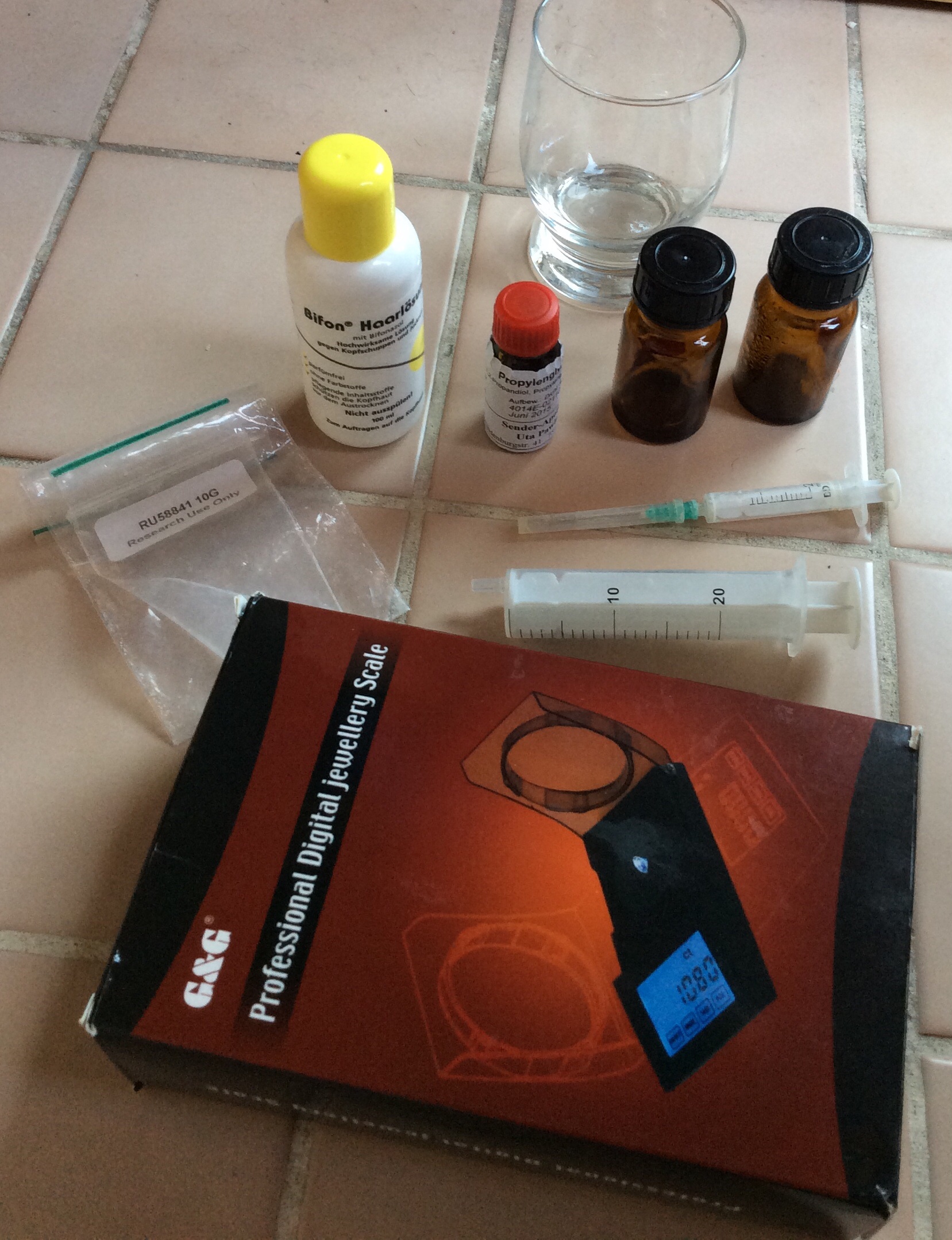 Kann's direkt da rausschütten und ganz gut portionieren. Als Gefäß für die fertige Lösung bin ich kürzlich von Braunglas auf Plastikflaschen umgestiegen (30ml). Die sind so leicht, dass ich die gleich als "Wiegegefäß" benutzen kann.