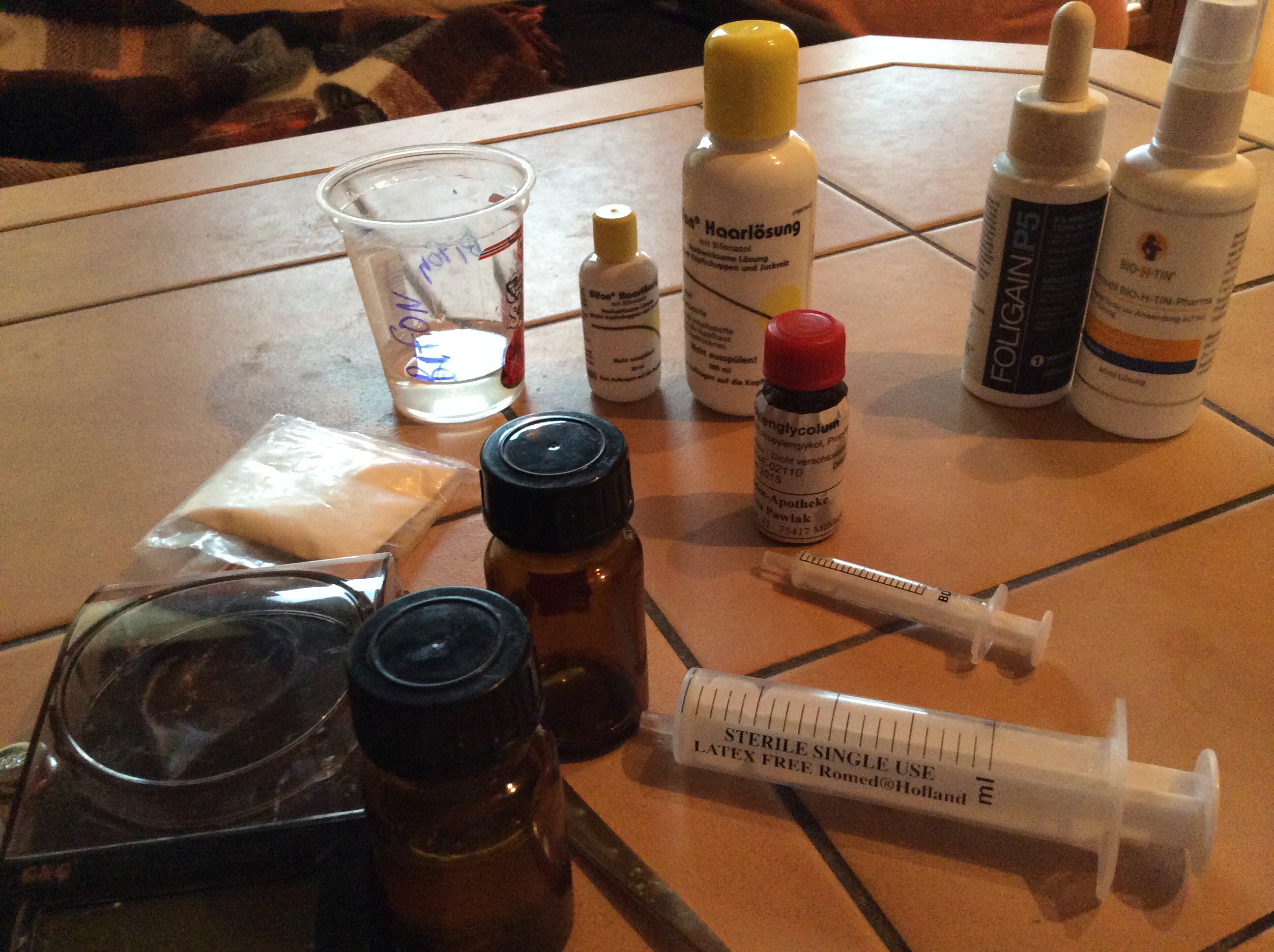 Hier noch mal ein Bild von allen Utensilien die du benötigst. Die zwei Flaschen rechts im Bild sind Minox. Braucht man also nicht wenn man es in Bifon (+ Propylenglycol) auflöst...