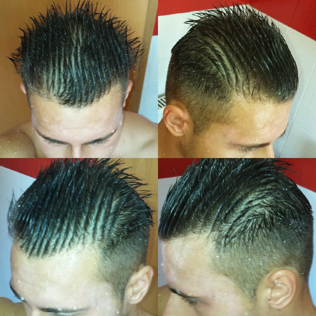 bei den frontal selfies is got2b strandmatte wax drauf und dann dick mit taft haarspray den wet look drauf und mit nem zackenkamm die front positioniert.