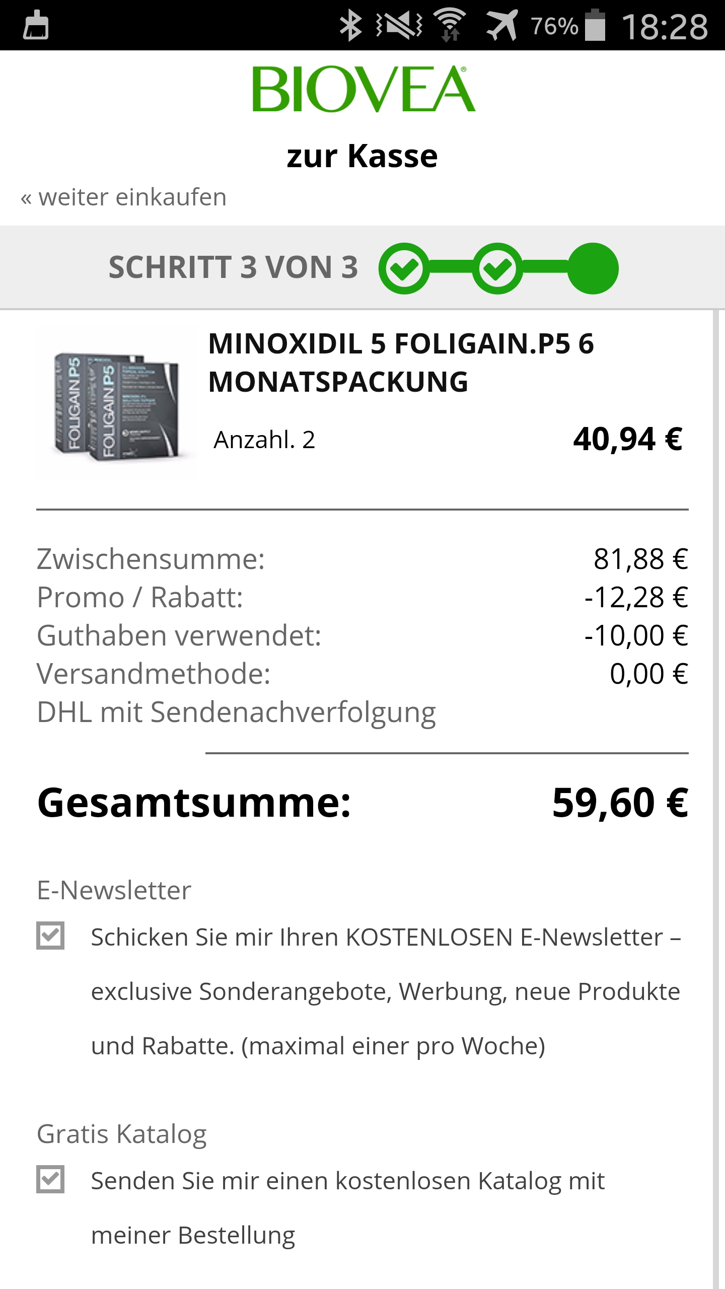 Minoxidil für effektiv 5 € im Monat beziehungsweise 2,50 € 1/2 verdünnt. Gute Möglichkeit einen Voratt anzulegen.