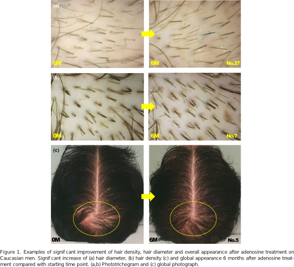 " The change in proportion of thick hair (≥60 μm) compared with baseline in the adenosine group was significantly higher than that in the placebo group (P < 0.0001). The change in vellus hair proportion (<40 μm) was significantly lower in the adenosine group than that in the placebo group (P = 0.0154). The change in hair density compared with baseline of the adenosine group was also significantly higher compared with that of the placebo group (P = 0.0470). "
