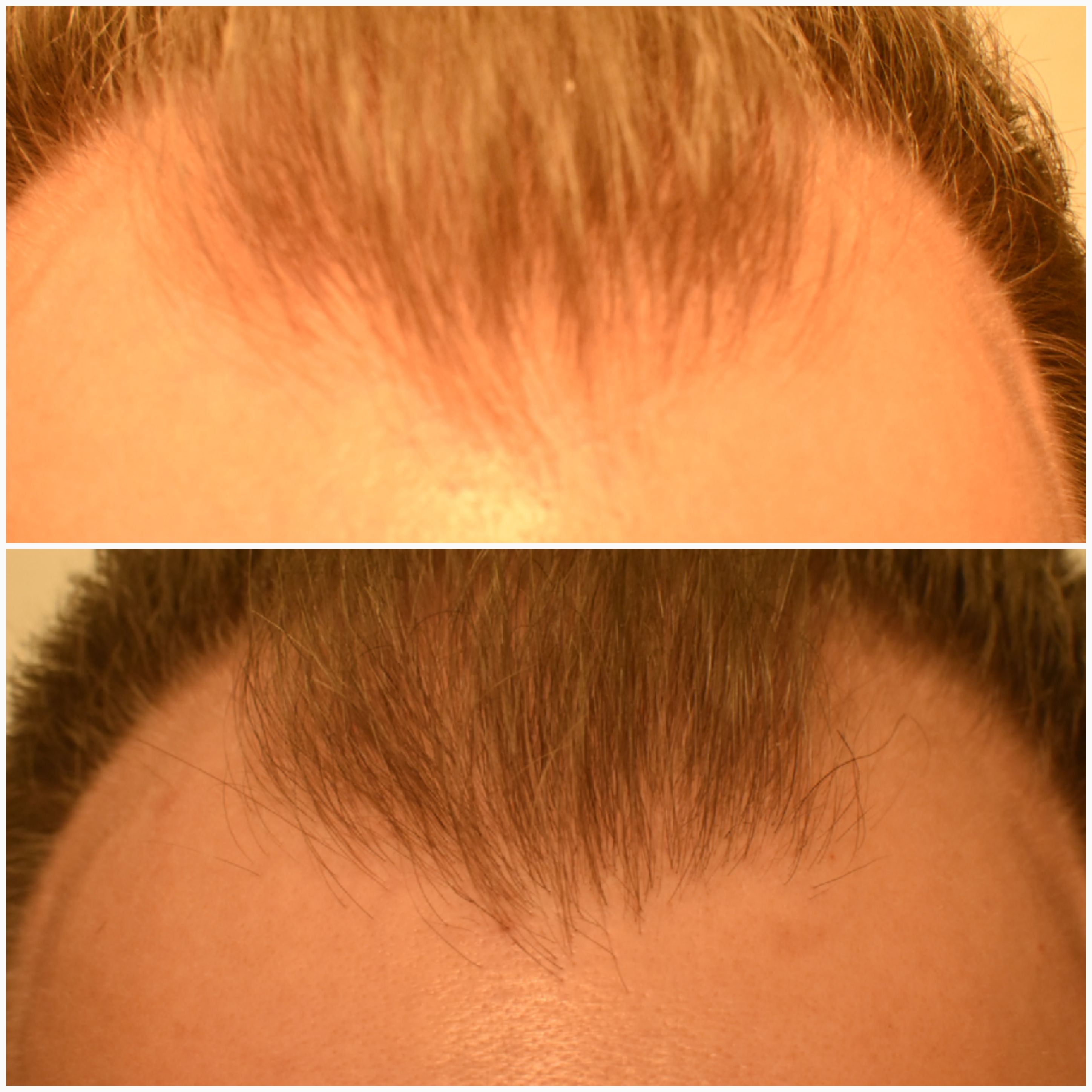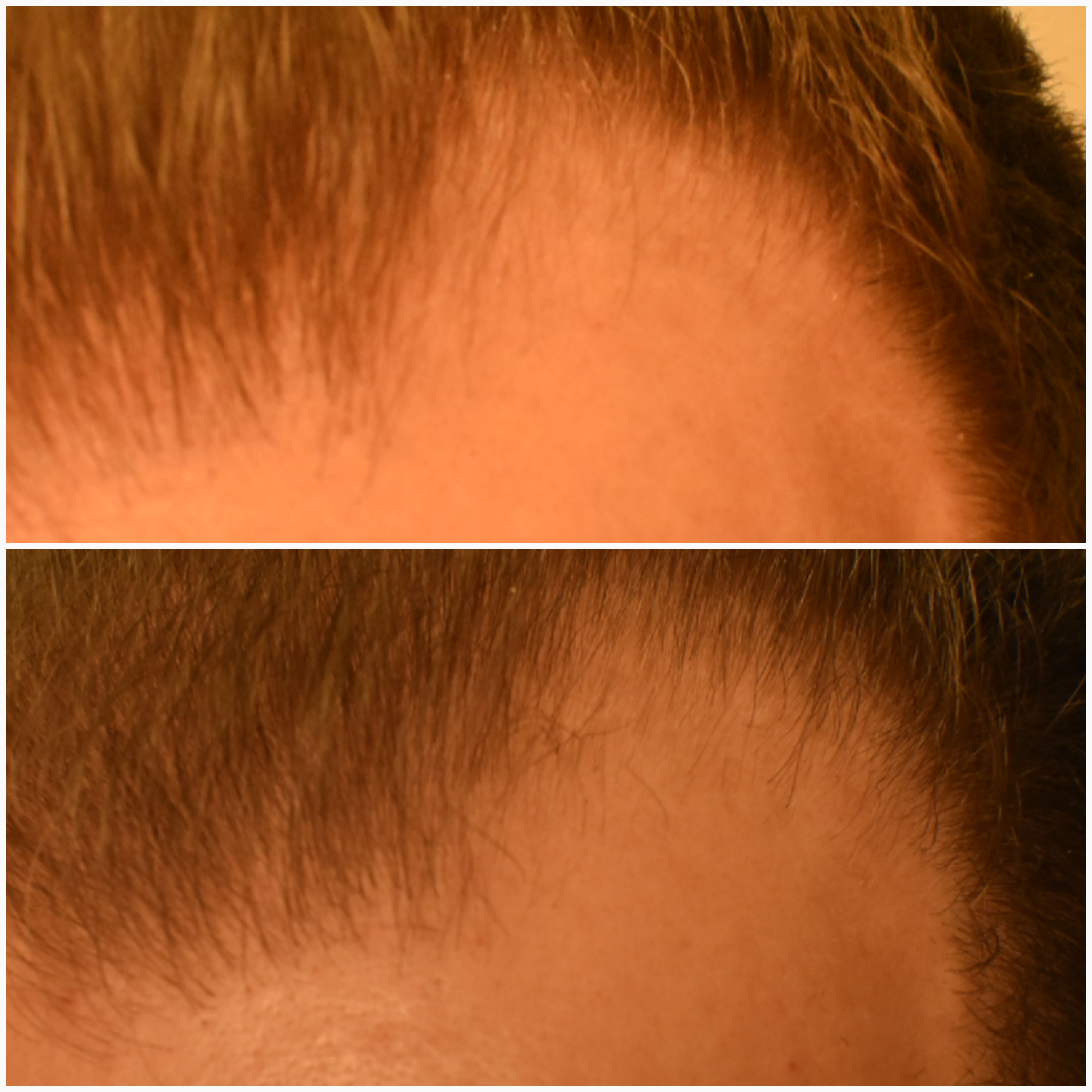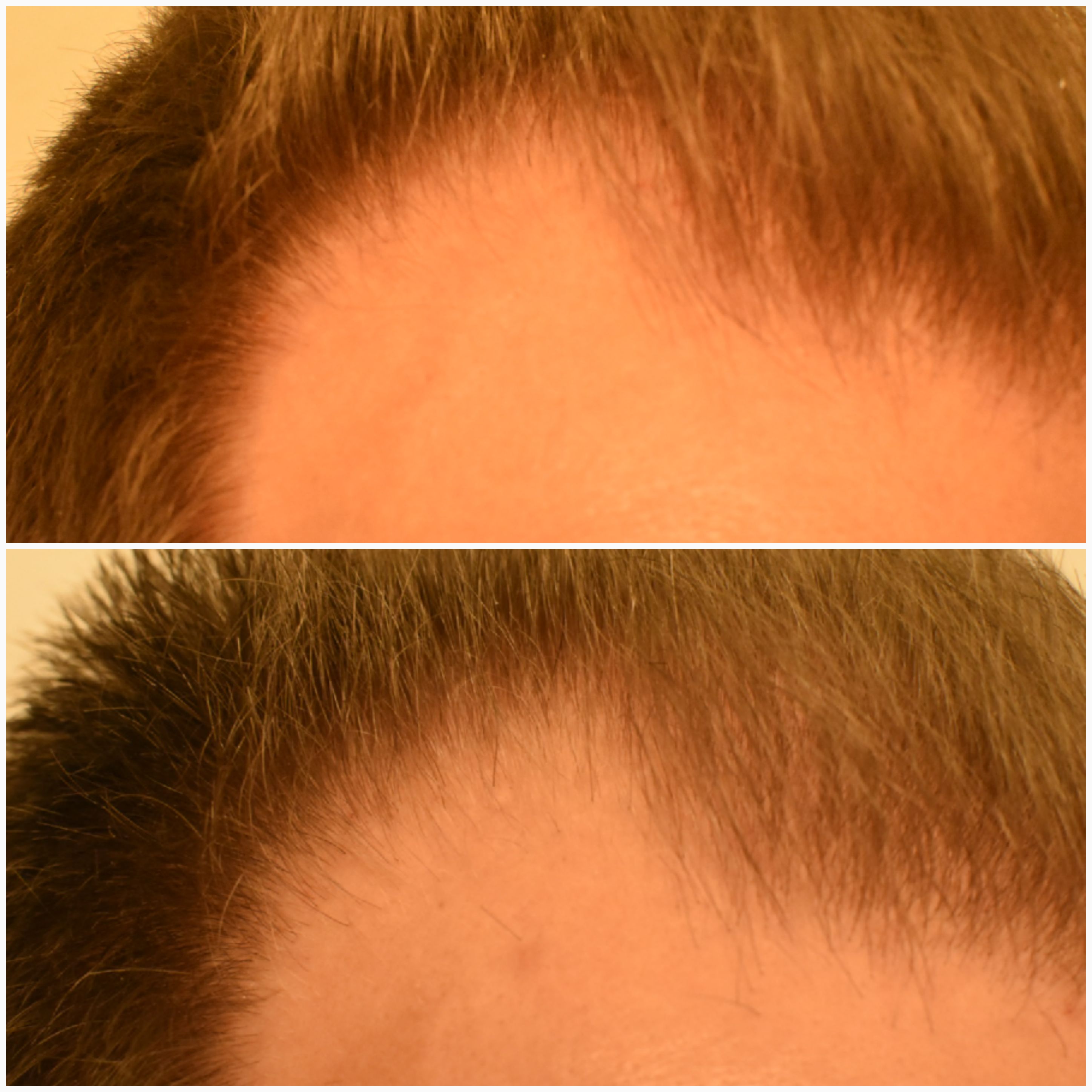 Subjektiv insgesamt weniger Haare. Ggf. an manchen Stellen ein neues Haar. Ein Orgasmus führt auf jeden Fall zu starkem Kopfhautjucken (innerhalb von ~10 Minuten, für etwa 1-3 Tage, mal stärker, mal weniger stark). Ohne Orgasmus kein Jucken.
