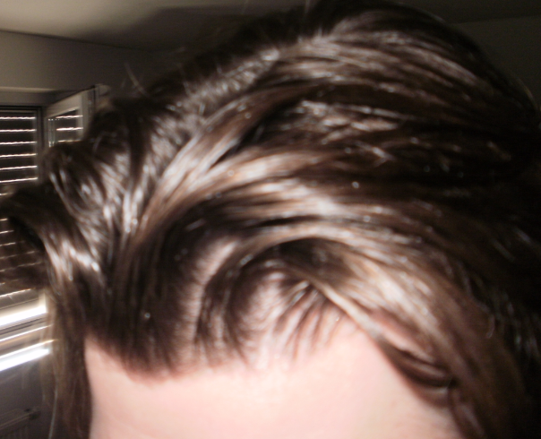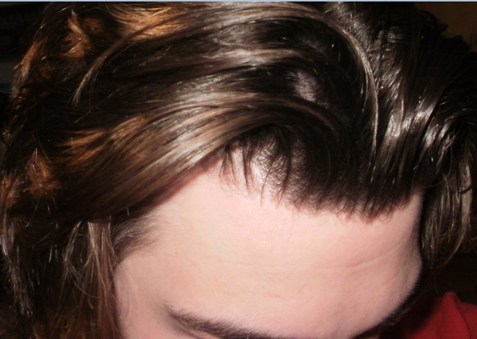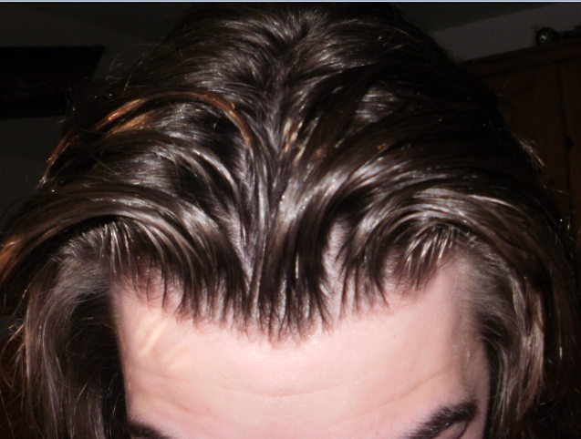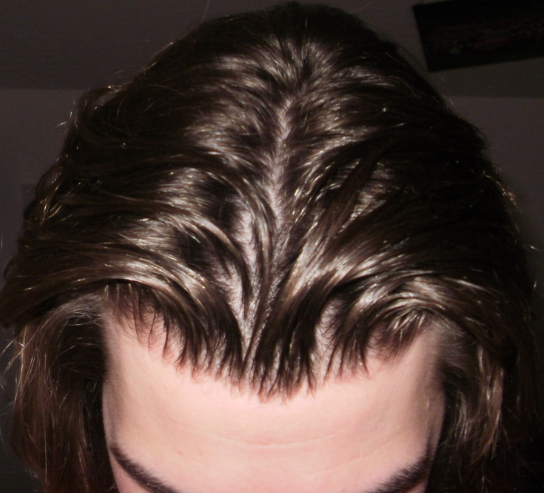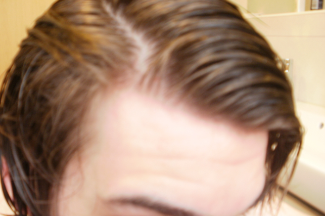 Das "Problem" bei den unteren Bildern ist ganz einfach, dass ein paar Haare nach vorne fallen und dadurch eine Lücke entsteht durch die das Licht die Kopfhaut durchschimmern lässt.