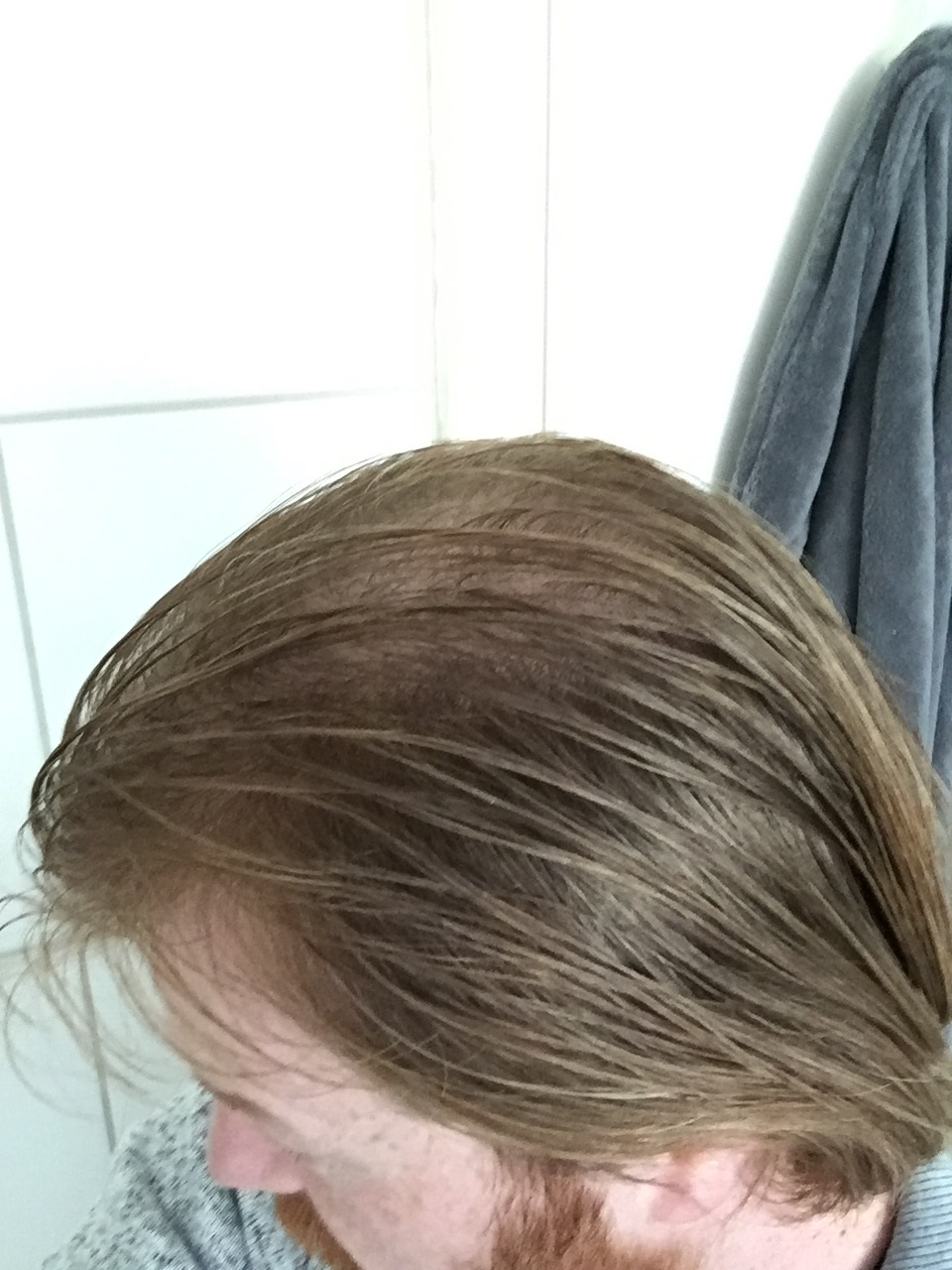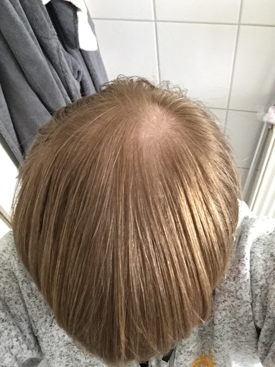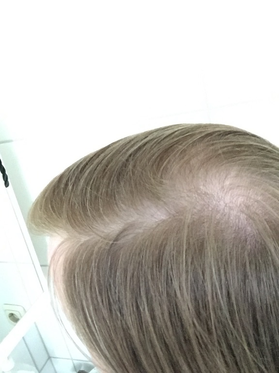 es sind noch überall haare vorhanden nur sehr sehr dünn kraftlos und ohne pikmente. daher sieht es im licht so aus als hätte ich keine bzw kaum noch haare an tonsur und oberkopf.