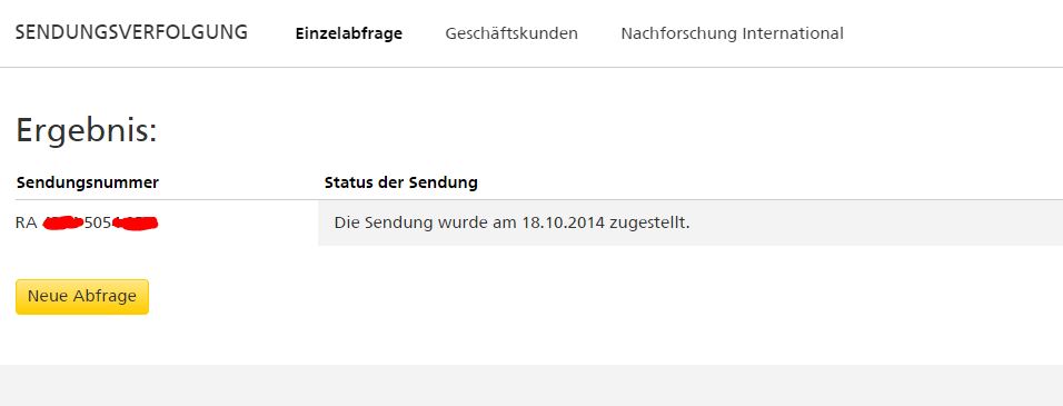 Ich hab eine Mail an die Post geschickt um herauszufinden ob das Einschreiben mit dieser Sendenummer an meine Adresse ging.