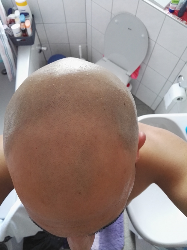 Nach der Nassrasur einen Aftershave zu schmieren, schmiere ich einfach Minox gemische drauf, brennt etwas, aber egal, vielleicht wirkt das auch deswegen so gut, direkt auf der Glatze.