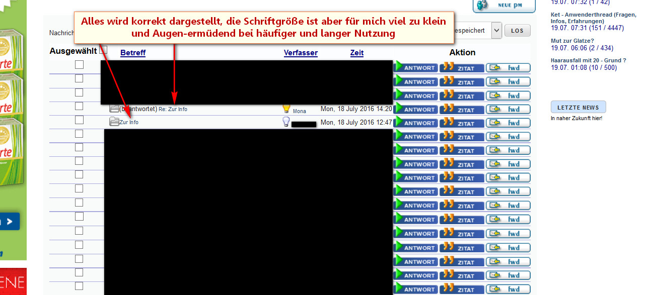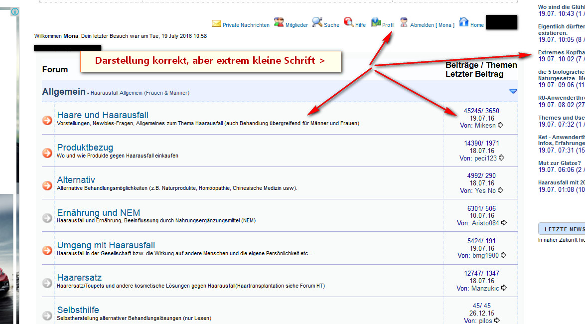 2) Manuell um 1 x "strg +" vergrößert, um Buttons, Usernamen und Texte etc. ohne Lupe lesen zu können. Nicht bezogen auf die Unterforen-Titel oder sonstige Überschriften, die sind ja groß genug.