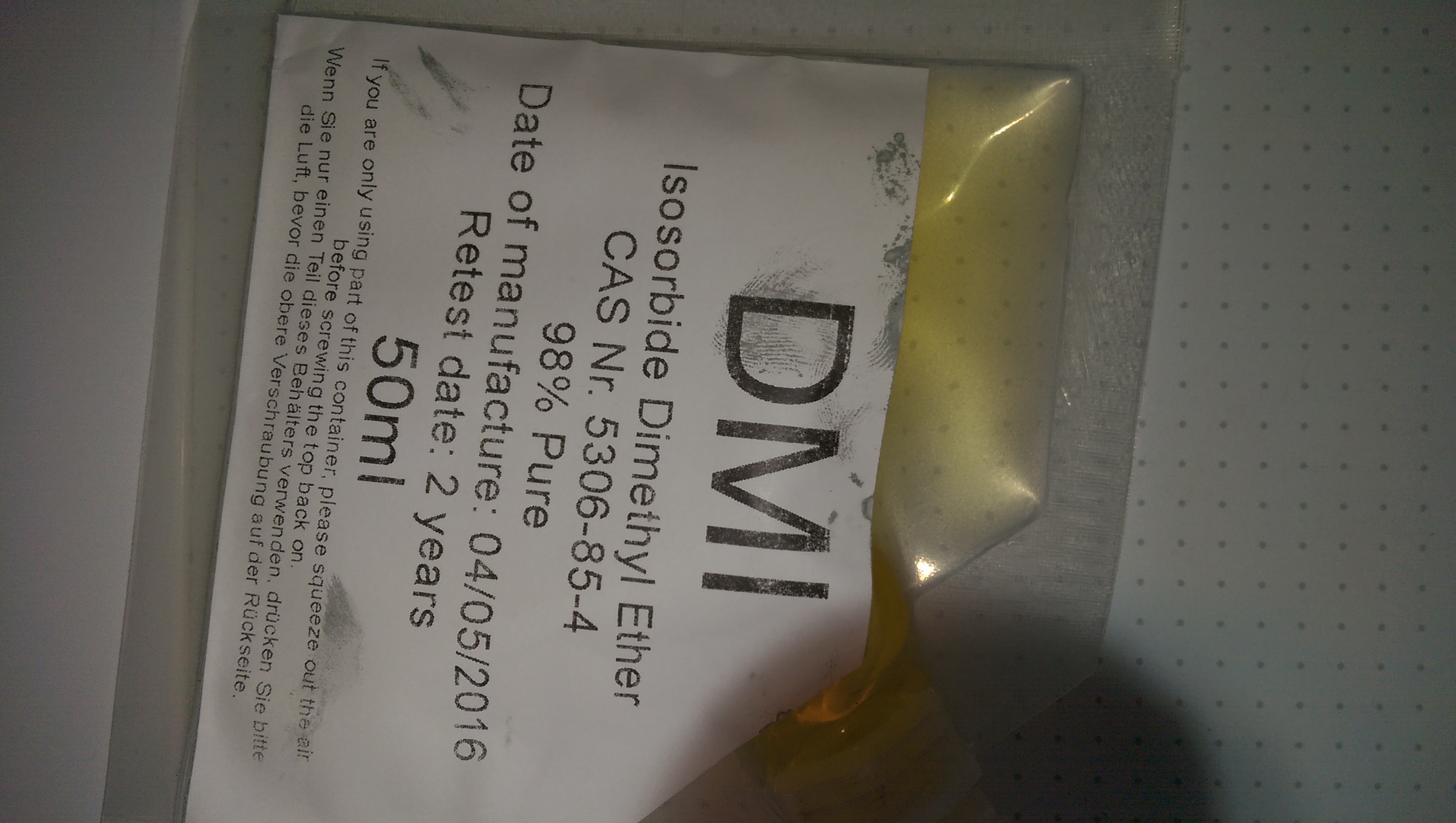 Hab jetzt auch das DMI von ebay erhalten (siehe Anhang) und bei mir bleibt die Lösung mit 5ml Weingeist, 2 ml DMI, 2,5ml PG und 25mg Seti auch noch am nächsten Tag glasklar(siehe Anhang).