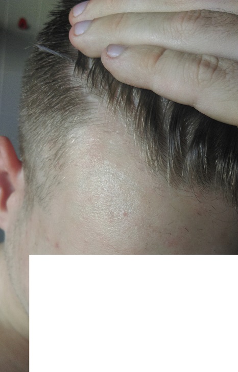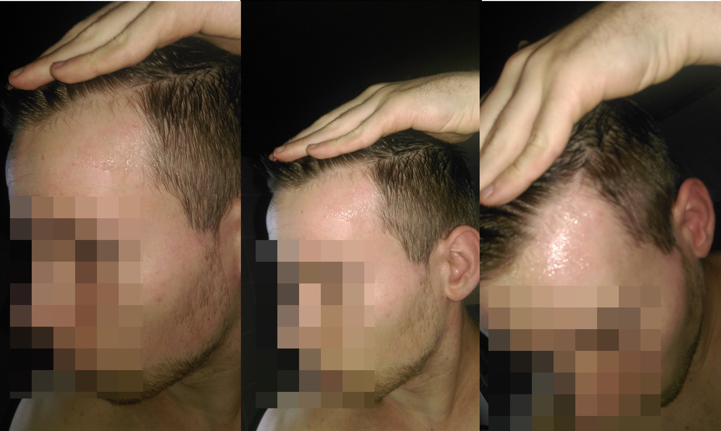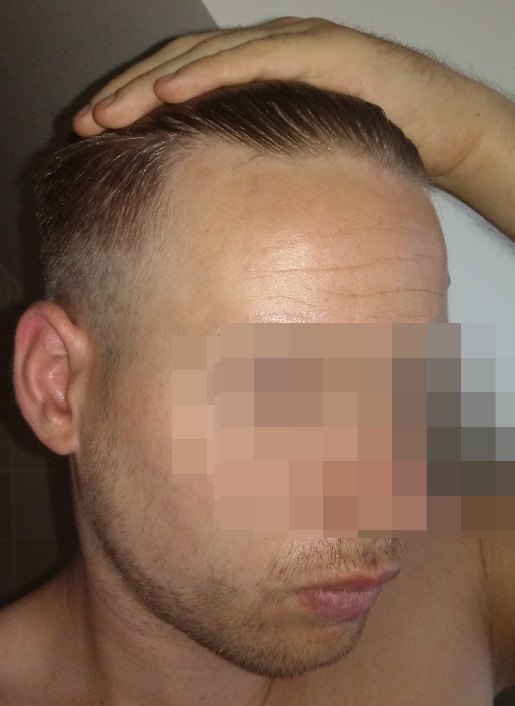 Dennoch ist unzweifelhaft AGA, dafür sprechen einfach die Familie (Onkel müttls. 20 NW3-4), die Miniaturisierungen und die immer schiefere Haarlinie. Gut sehen kann man es auch, wenn man die Stirnfalten anspannt, die "neue AGA-Fläche" ist quasi nicht muskulär ansprechbar.