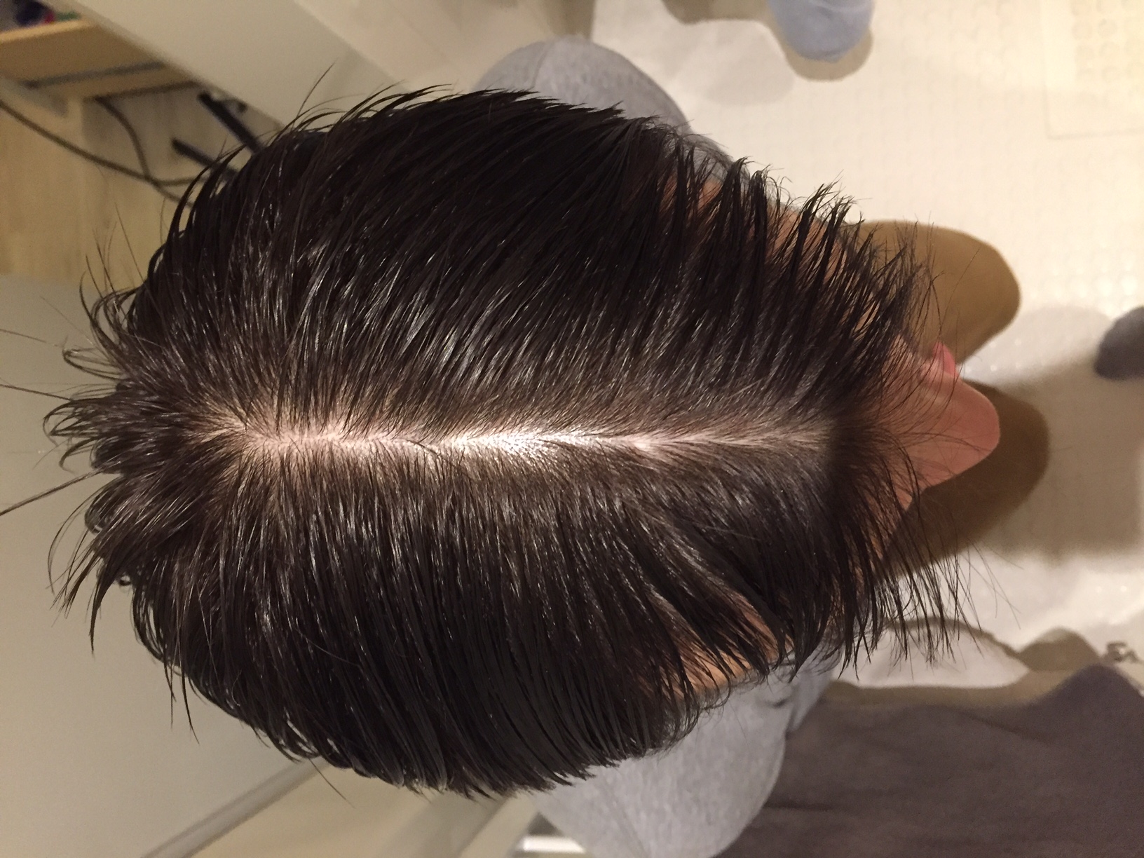 Danke für eure schnelle Hilfe. Hier noch eins mit nassen Haaren und Scheitel. Im Frontbereich habe ich eine Narbe aus Jugendzeiten.