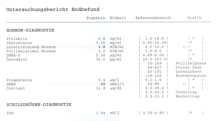 sind im oberen Bild Blutwerte aufgeführt,die zu untersuchen sind.Zusätzlich noch Östrogen und Prolactin,sowie Schilddrüsenhormone.Dann hier einstellen,und interpretieren lassen.