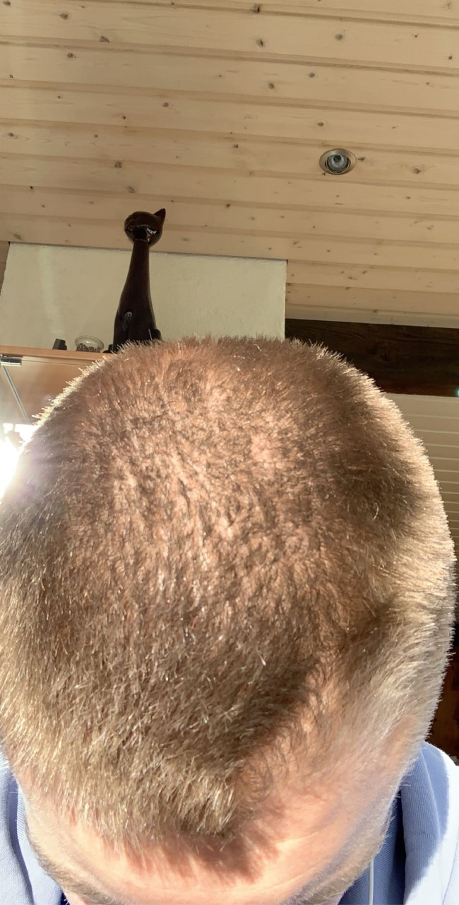 Der HA breiter sich nun über den ganzen oberkopf aus. Die Haare werden dünner und dünner. Da die Haare noch recht lang sind kann ich das noch recht gut verdecken - die Frage ist nur wie lange noch Surprised Bei einem Milimeterschnitt würde man die Kopfhaut sehr gut sehen, vor ein paar Monaten noch undenkbar gewesen.