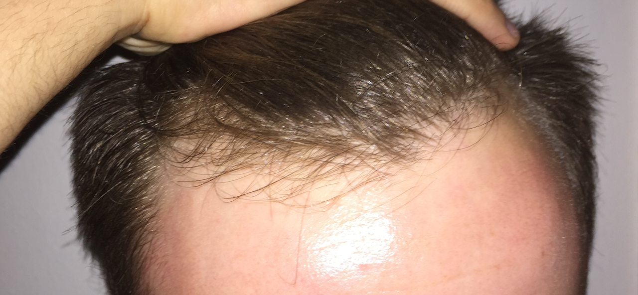 Bei den Geheimratsecken/an der Front sieht man mMn etwas angegriffene Haare, allerdings jetzt auch nicht unbedingt dramatisch.