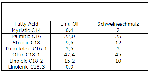 ob ich emu nehme oder anderes vogelfett vom huhn ente gans..usw...von der zusammensetzung der fettsäuren gibt es kaum einen unterschied