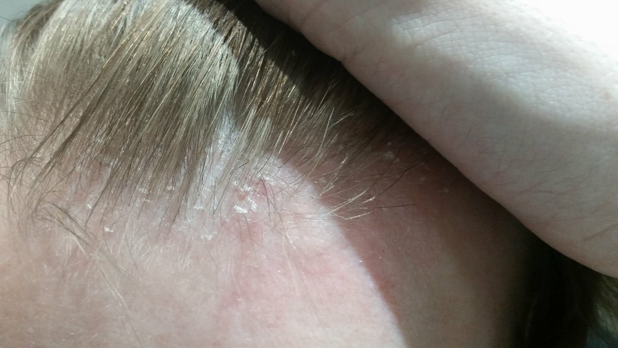 Kopfhaut komplett ausgetrocknet. Kopfhaut ziehen, wahnsinnige Schuppen und teilweise kleine Krusten am Kopf verteilt. Zusätzlich extrem vermehrter Haarausfall (von ca. 50-70 auf 100-120) und an den ausgefallenen Haaren hängen am Ende Schüppchen oder Talgkügelchen.