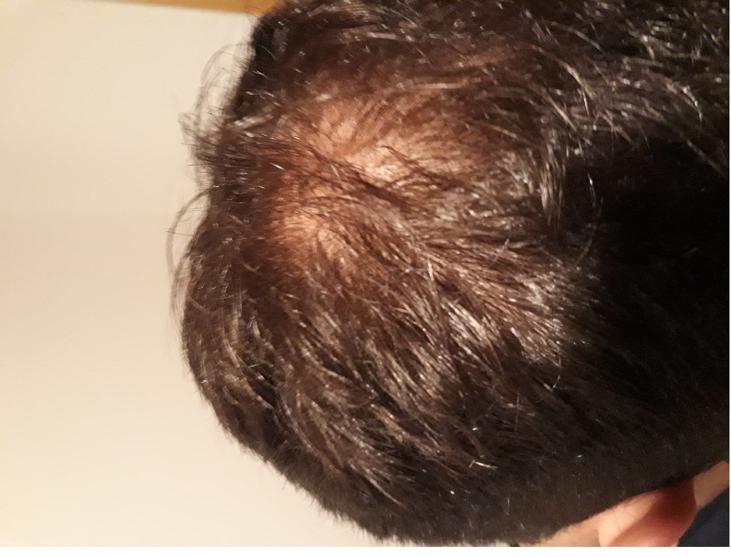 Seit ca 3 Jahren fallen bei mir vermehrt Haare am Oberkopf aus. Der Hautarzt bestätigte mir AGA und hat mir Minox 1x täglich empfohlen.