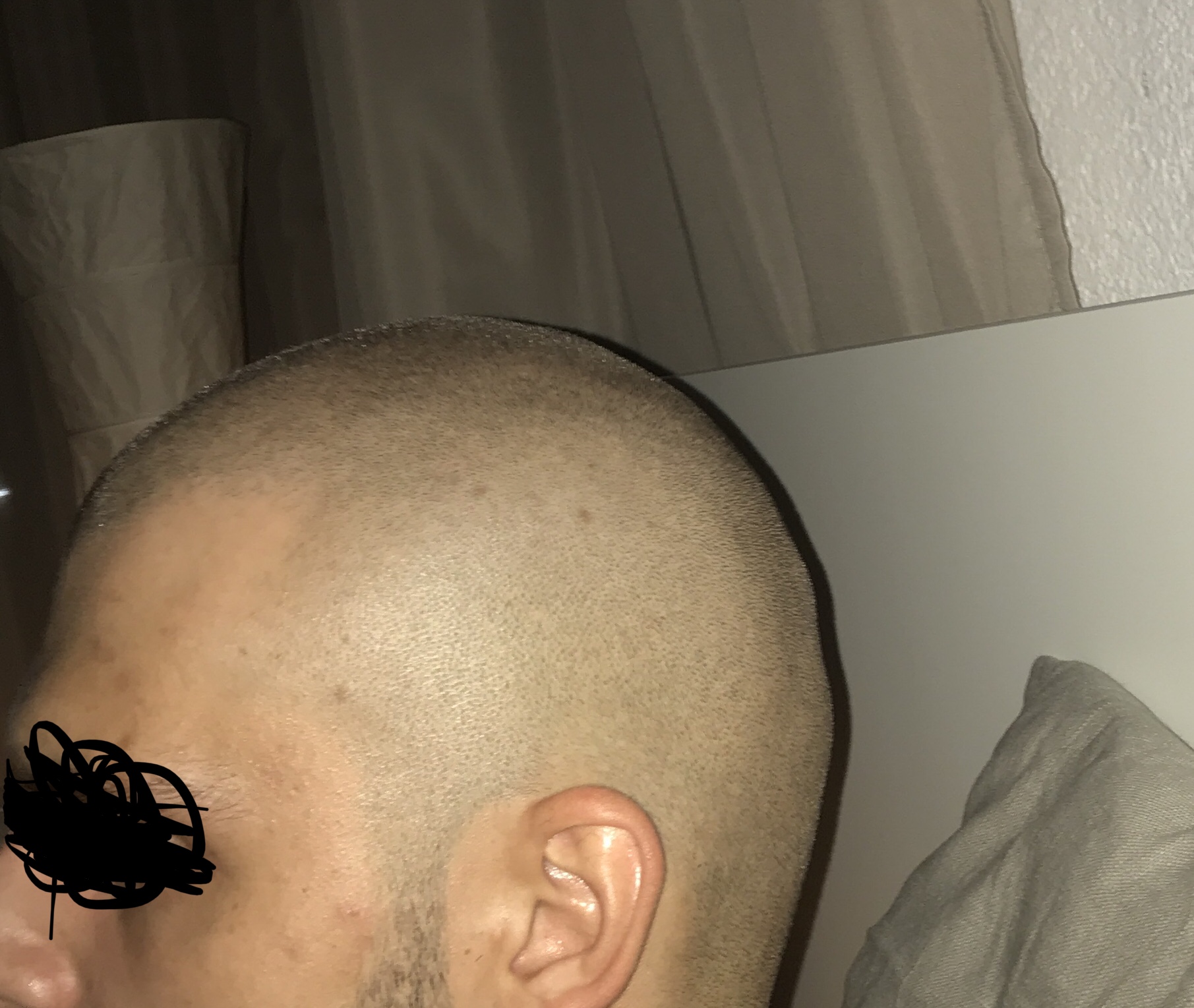Anbei Foto: geht nur darum wie die Kopfhaut wieder aussieht. Ich hoffe es bessert sich weiter. Ich drücke allen die Daumen.