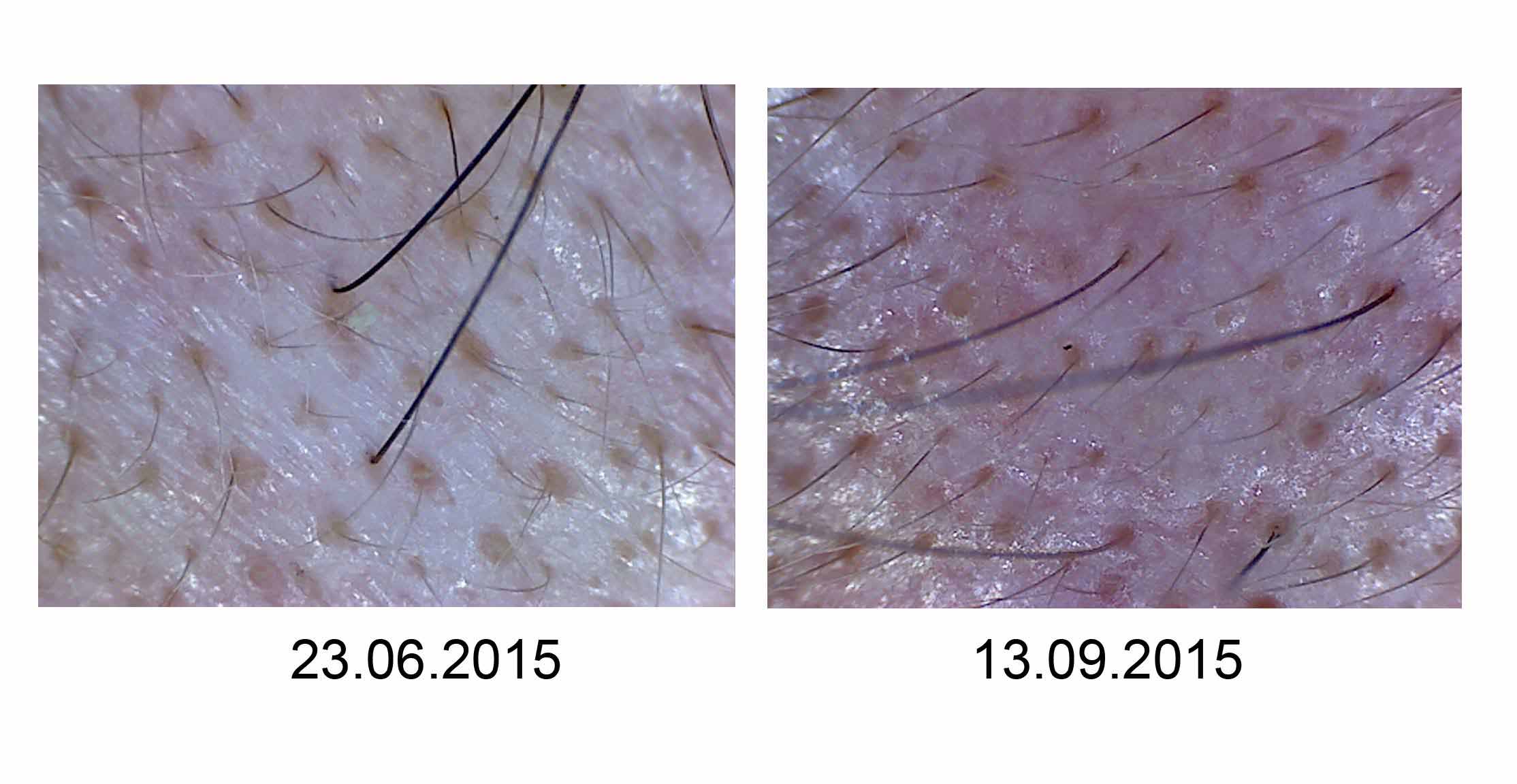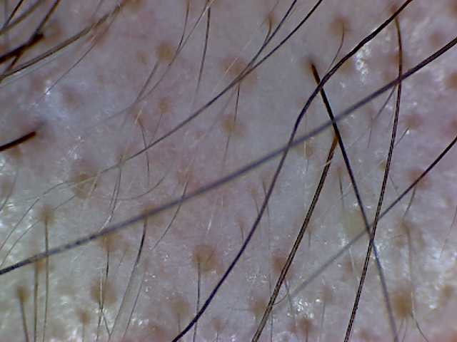 hier mal 2 Scans mit einem digitalen Mikroskop, allerdings von zwei unterschiedlichen Stellen/Seiten meiner Geheimratsecken, Stand Juni 2015 vs Sept 2015 (auf jeden Fall beides Mal die vormals recht kahlen Stellen).