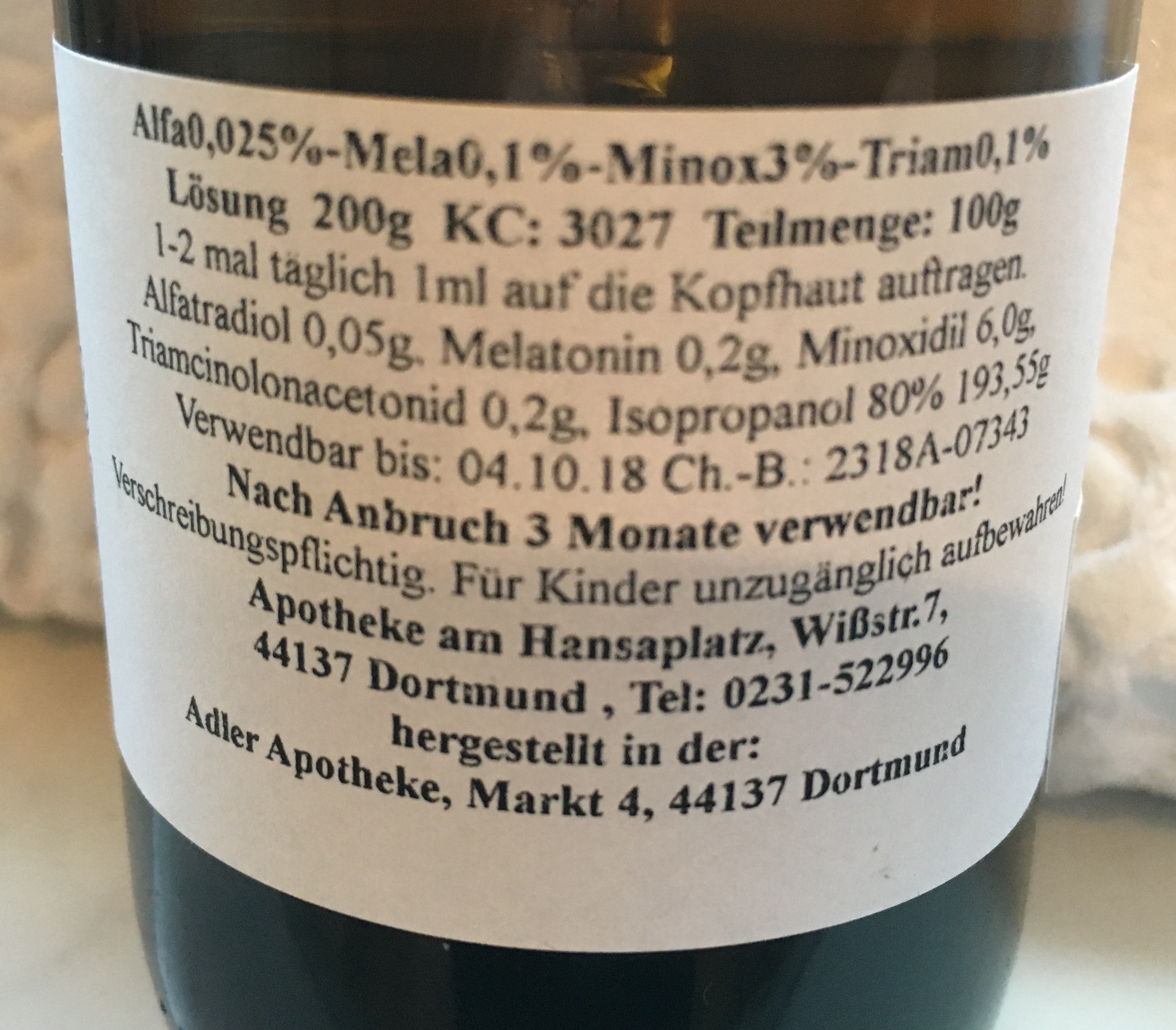 ich möchte 75mg pro tag auftragen. dazu mache ich mir eine 5% lösung in minox. mischen will ich 1x in der woche. ich nehme also 10,5 ml minox, mische 525 mg ru hinein, löse es auf und lagere es im schrank in einer braunflasche. ich wende pro tag 1,5 ml der mischung an, anwendung mit 1ml spritze mit stumpfer kanüle.