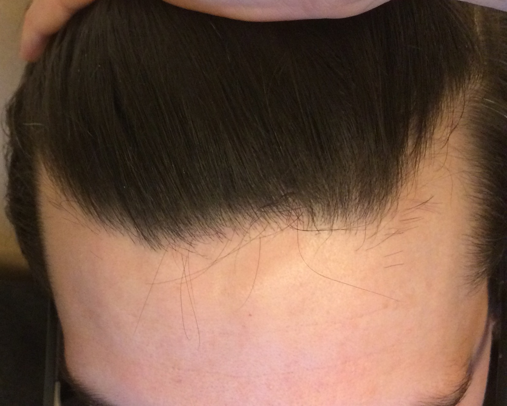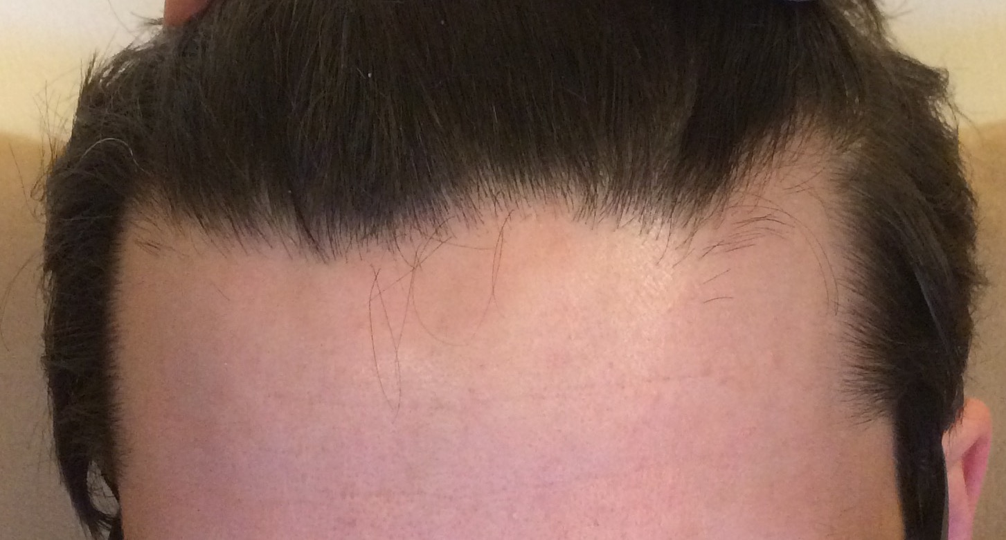 Er bekommt leichte Geheimratsecken und entlang der Haarlinie stehen einige einzelne Haare die uns sagen, dass da vorher mal etwas war.