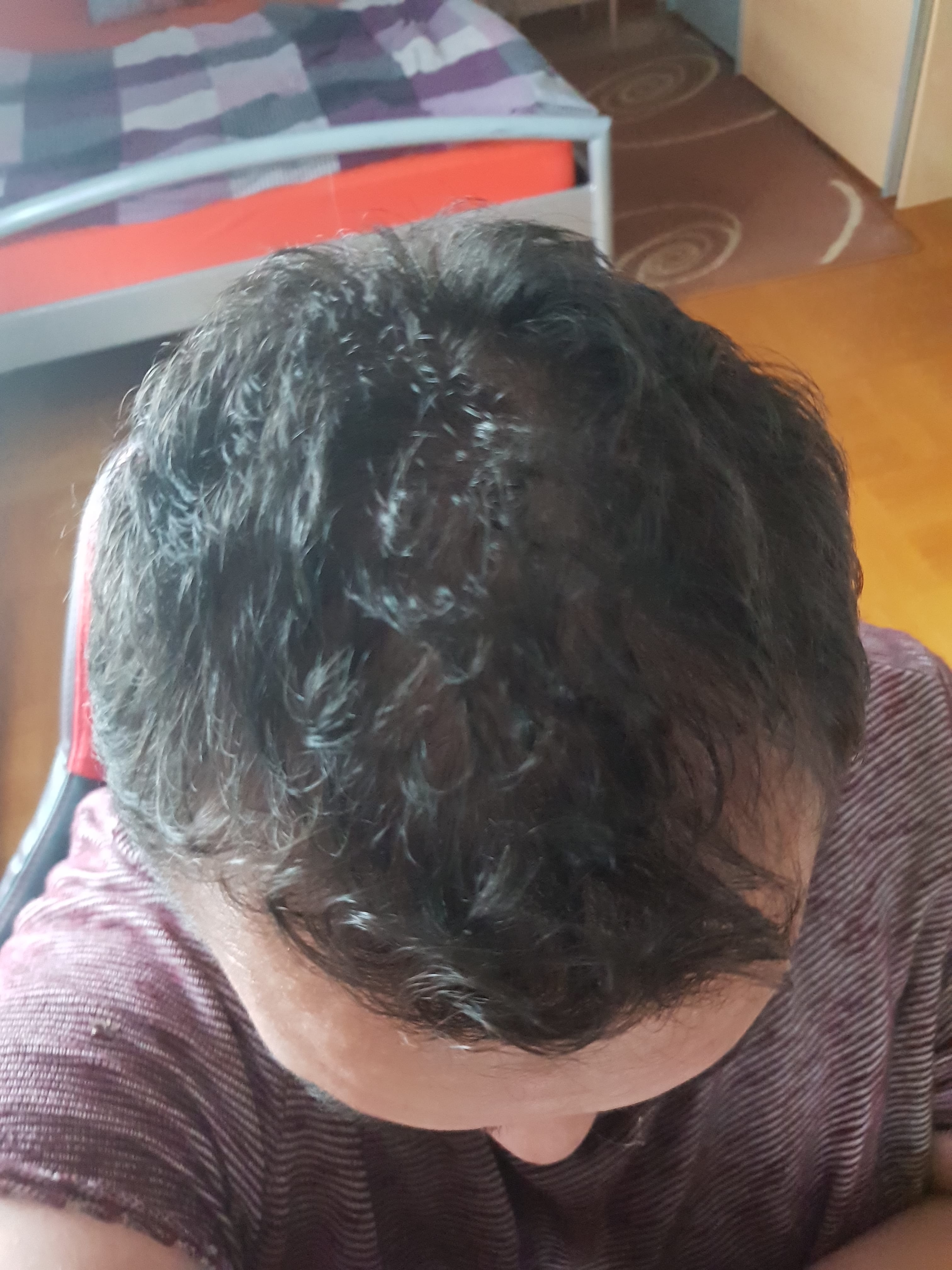 @Theadersteller, der Status sieht schlimmer aus als er ist, weil die Haare sehr ungeordnet Strähnen bilden und nach allen Seiten fallen. Zum bewerten für die Zukunft, Haare glatt nach unten kämmen.