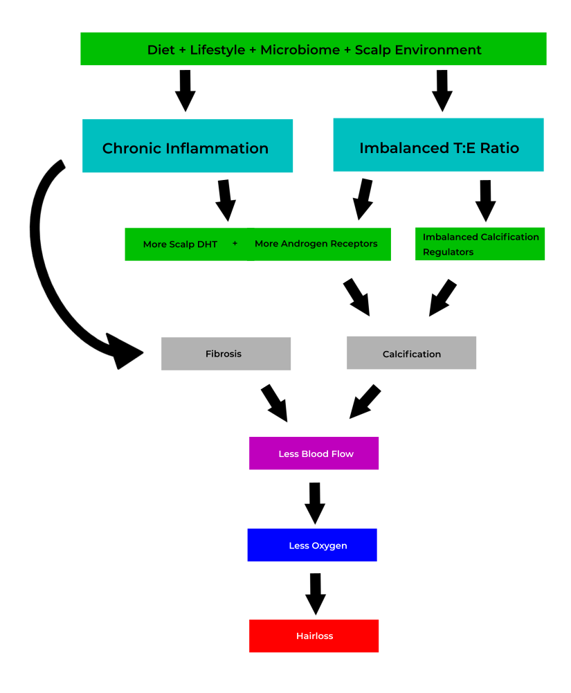 Die groesste Huerde einer jeden AGA-Behandlung sind Verkalkung und Fibrose. Und ohne diese zwei chronischen, progressiv schlimmer werdende Gegebenheiten umzukehren, wird kein Mittel, kein Supplement, kein Topical und keine Therapie AGA wirklich effektiv behandeln. (Und mit effektiv meint der Autor Neuwuchs)