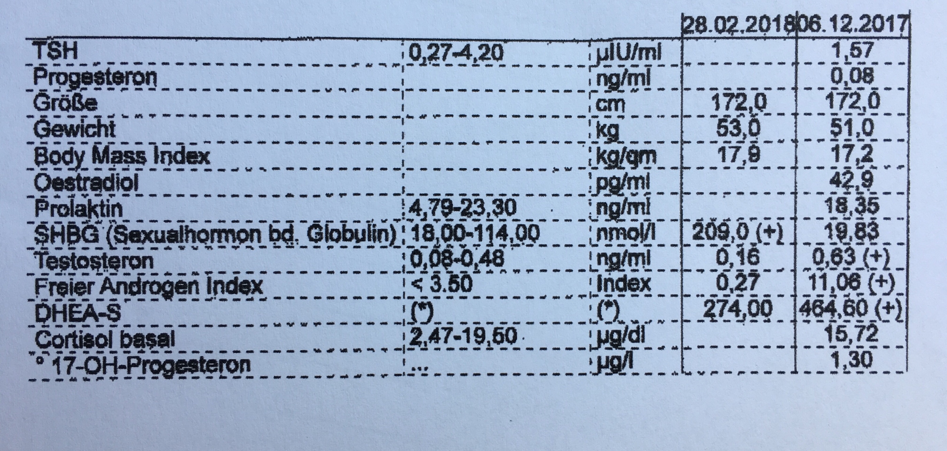 Dann 3x Hormonstatus -> Bei der ersten Abnahme wurden folgende Werte untersucht: TSH, Progesteron, Östradiol, Prolaktin, SHBG, Testosteron, Freier Androhen Index, DHEA-S, Cortisol basal, 17-OH-Progesteron