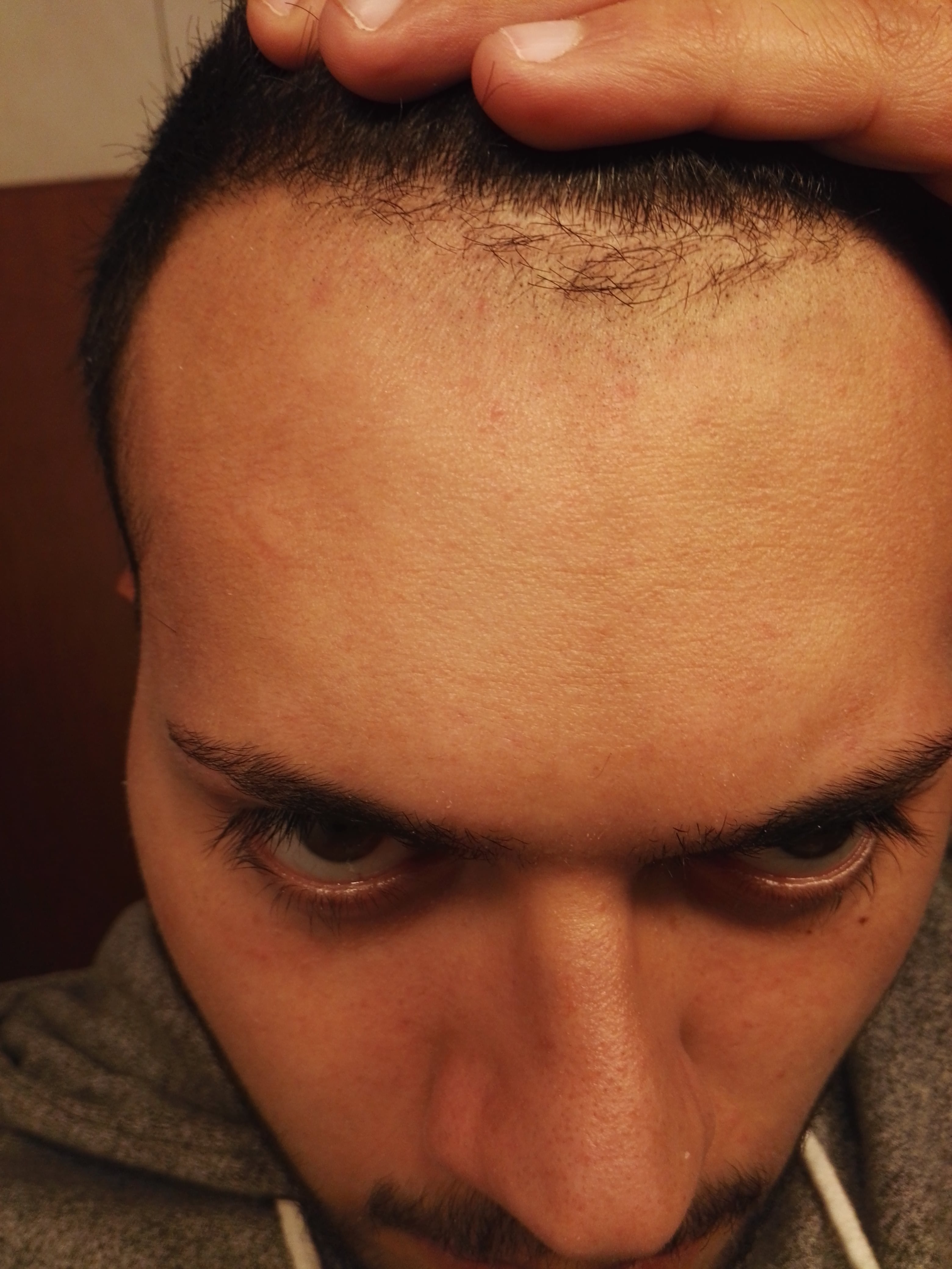 Hier der komische Haaransatz, manche Stoppel die gezupft werden sind gut zu erkennen. Würde ich sie nachwachsen lassen sehe, dass ganze wie oben beschrieben aus.