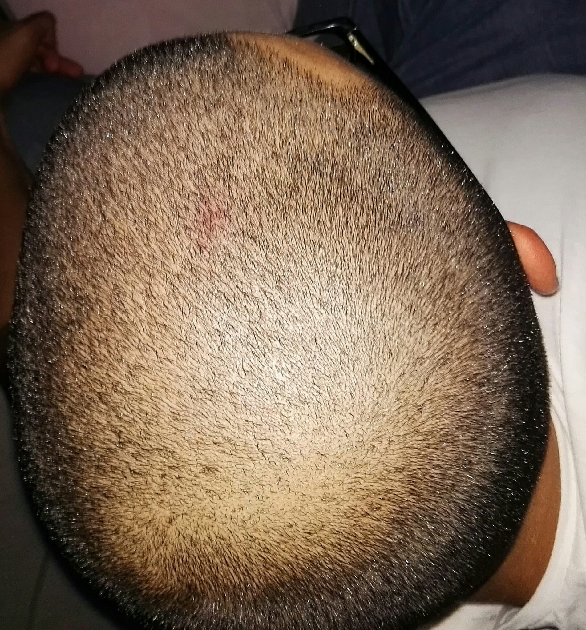 Als die Haare noch kürzer waren. dünnere/wenigere Haare am Haarwirbel...sieht man gut wenn man hineinzoomt. Sieht man bei der momentanen länge aber nicht gut genug, fühle ich aber mit meinen Fingern. Vielleicht eine beginnende Tonsur??