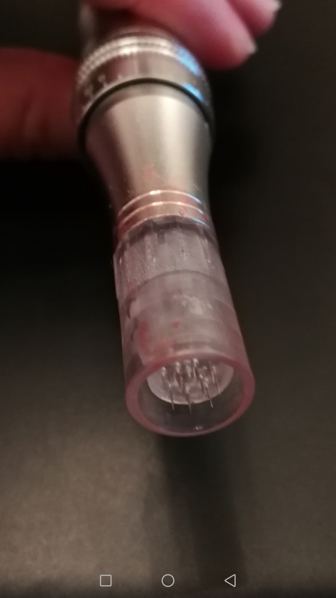 Ich hatte heute meine dritte Session mit dem Dermapen. Die Schmerzen waren echt hart und ich war am Ende richtig ausgelaugt. Als ich nach der Session meinen Kopf abgespült habe, war sas Wasser in der Dusche komplett rot. So sah der Pen nach der Behandlung aus: