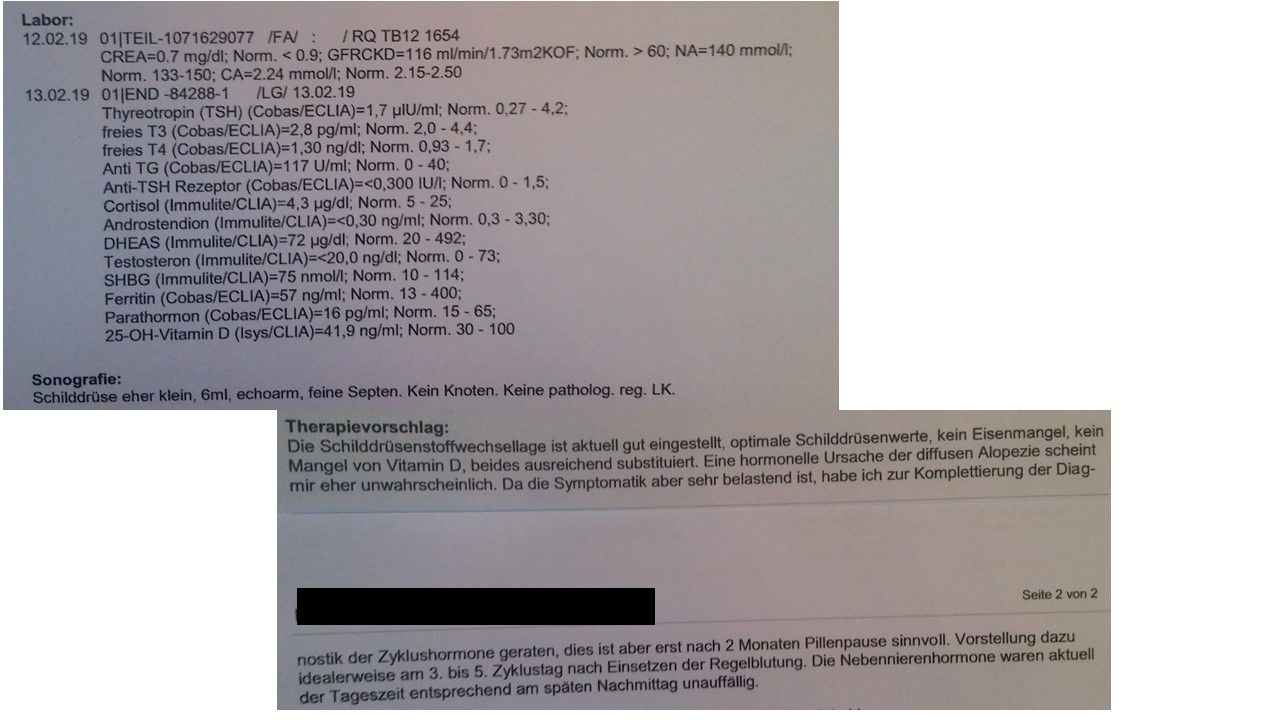Nach versch. Arztbesuchen beim Endokrinologen und Hautarzt kam heraus, dass ich eine Schilddrüsenunterfunktion habe (TSH Wert 5,7), Eisenmangel und VitaminD-Mangel.